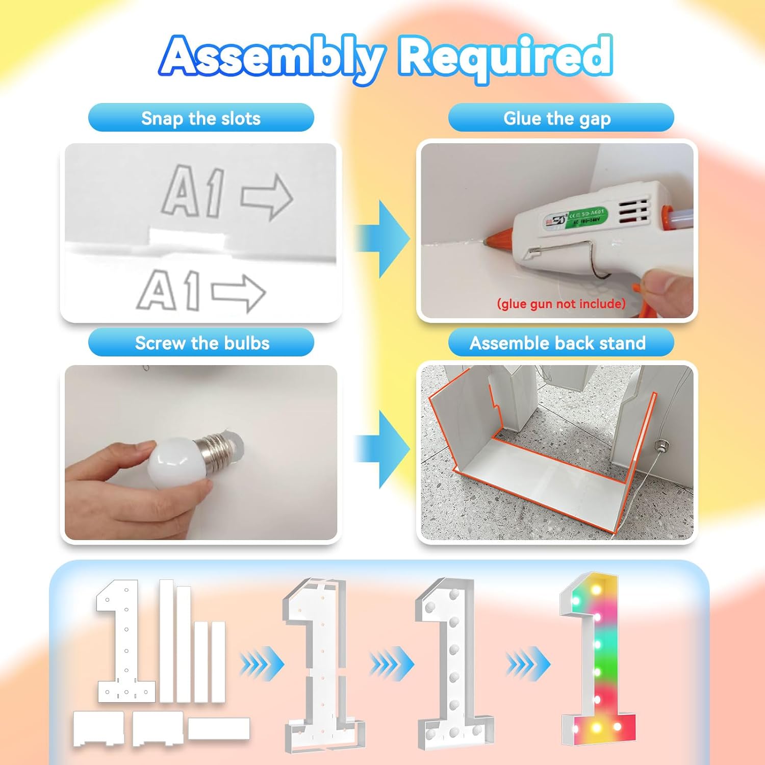 • 【Assembly Required】 4FT Marquee numbers are composed of pre-cut foam plates, and also include a remote control, bulbs, and corresponding LED light strings. The product comes with detailed installation instructions and video installation tutorials, making it easy for one person to assemble. When these large light up numbers and numbers come on, your party can achieve amazing decorative effects.