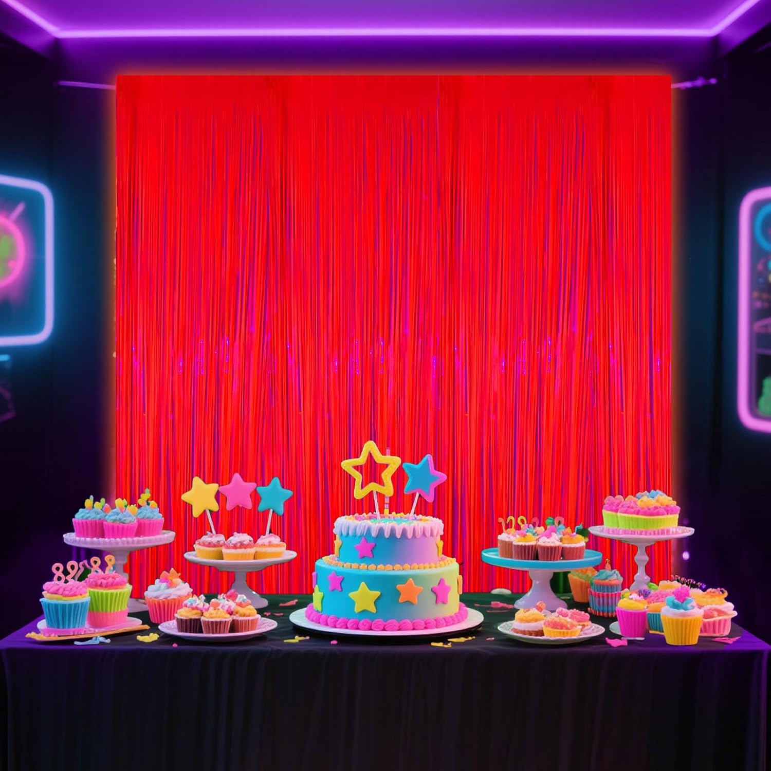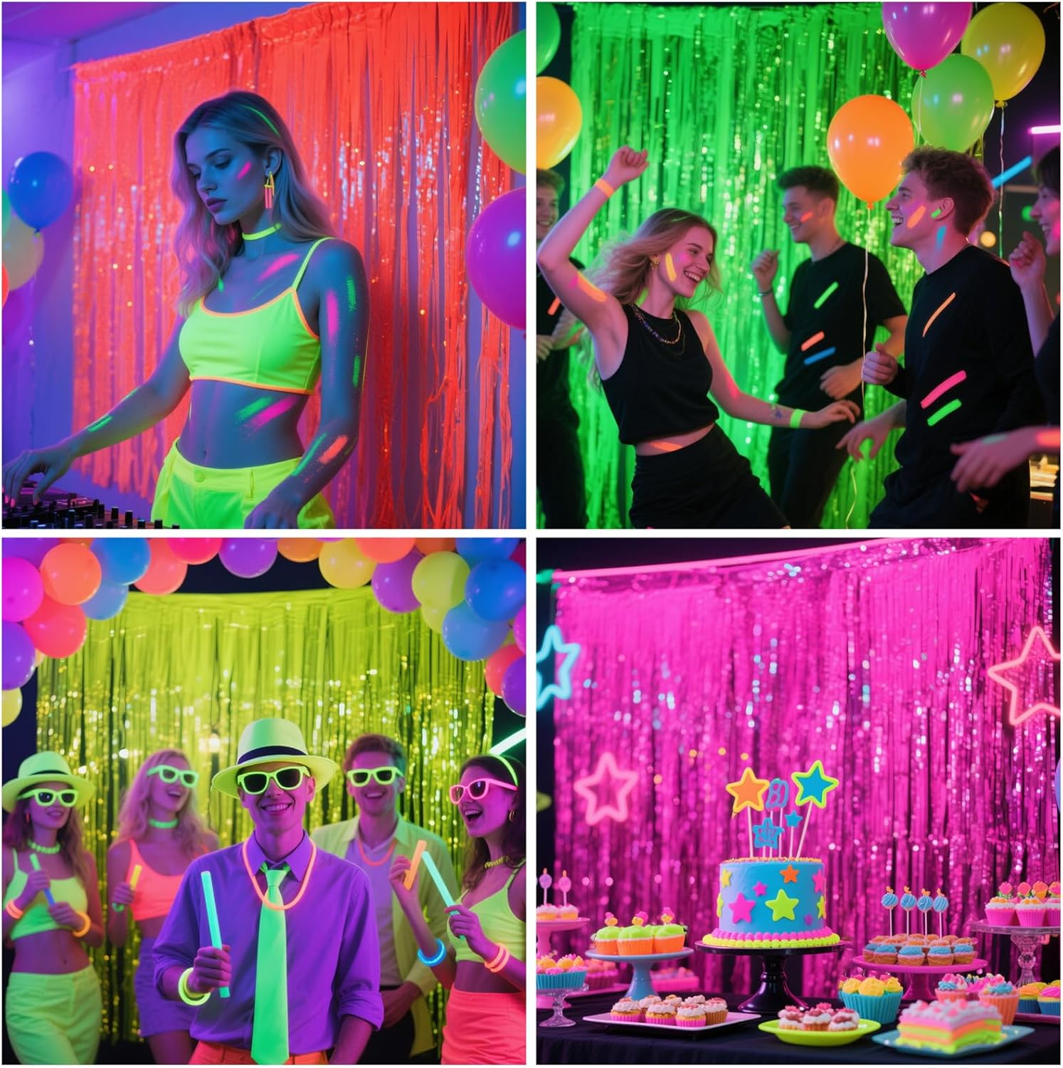 • Glow in the Dark Party Supplies: You will get 4 pcs fluorescent macaron orange tinsel backdrop, size: 6.6ft*3.3ft. The foil fringe curtains are perfect for blacklight dark glow party decorations, on the door or wall to create an impressive decoration for parties, events, and photo booths.