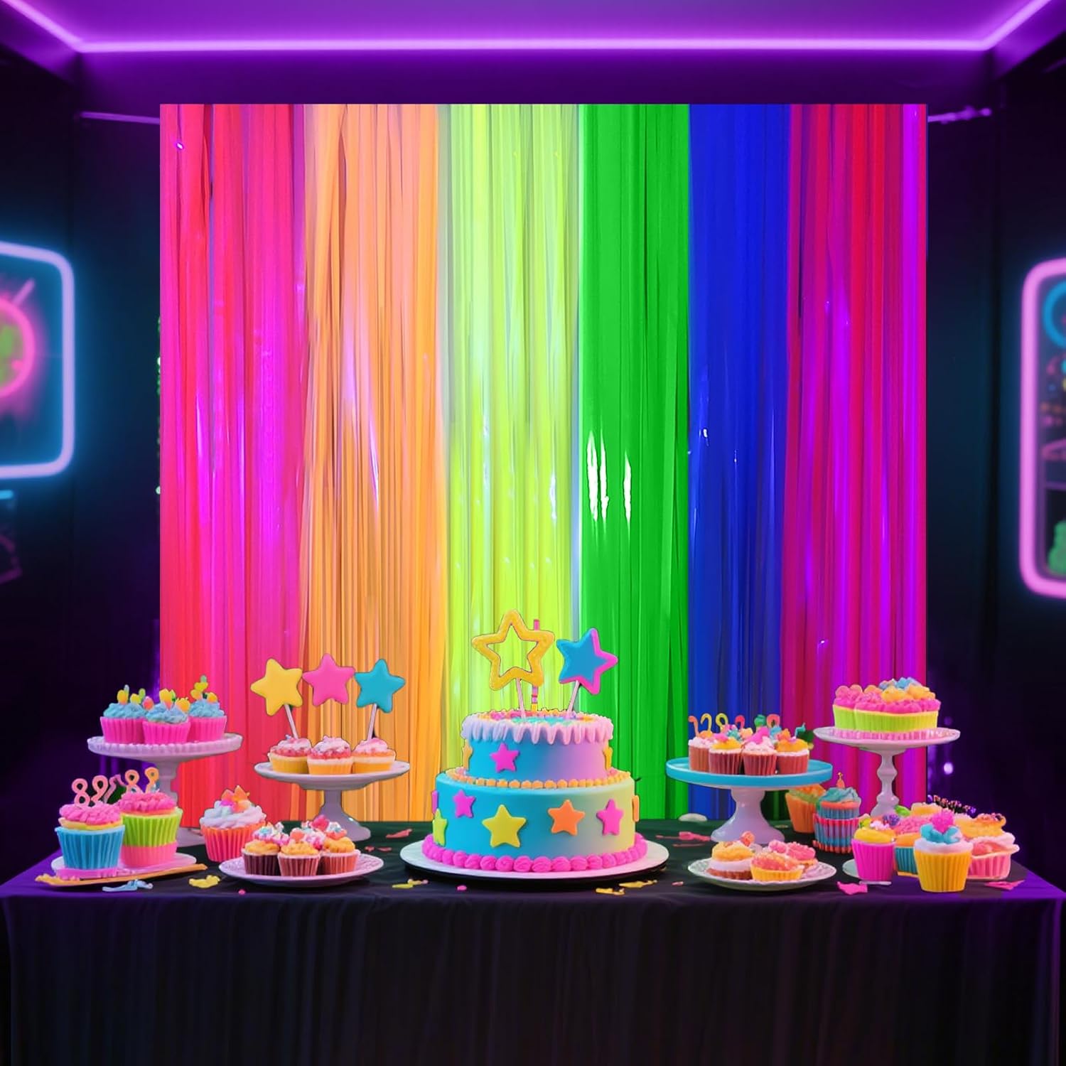 • Glow in the Dark Party Supplies: You will get 4 pcs fluorescent macaron rainbow tinsel backdrop, size: 6.6ft*3.3ft. The foil fringe curtains are perfect for blacklight dark glow party decorations, on the door or wall to create an impressive decoration for parties, events, and photo booths.