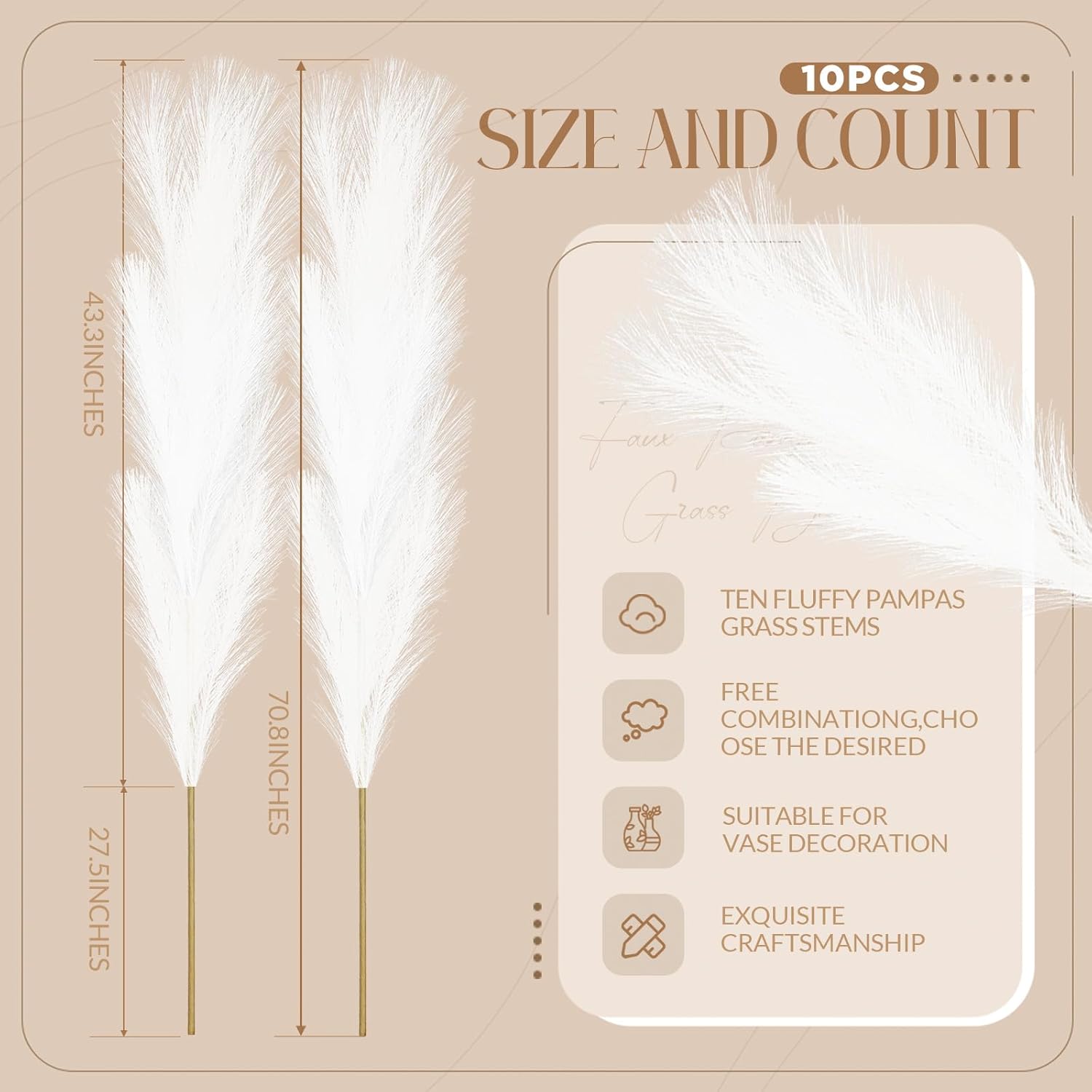 Zeyune 10 Pcs 71'' Large Faux Pampas Grass Decor Tall Artificial Pompous Grass Bulk for Boho Floor Vase Filler Wedding Floral Arrangements Home Baby Shower and Boho Decor (White)