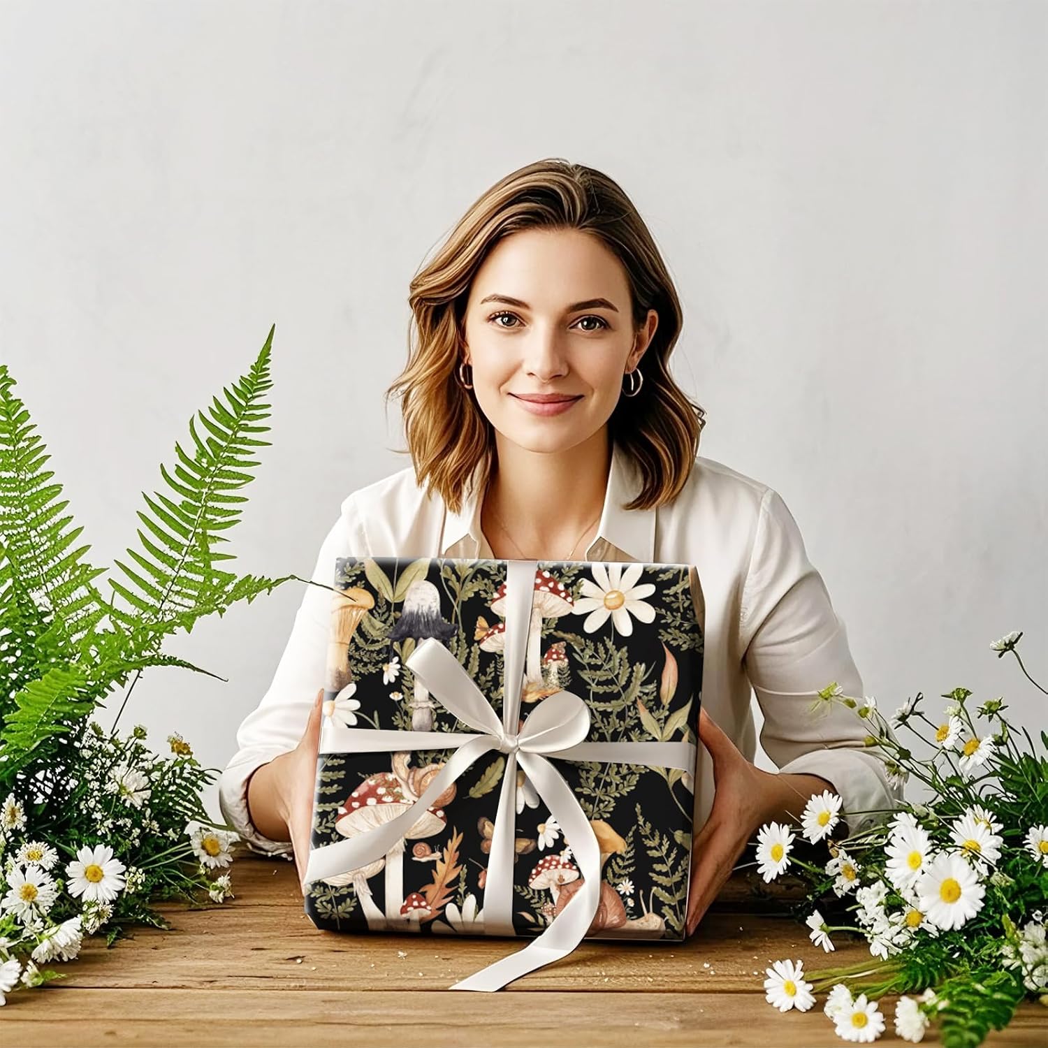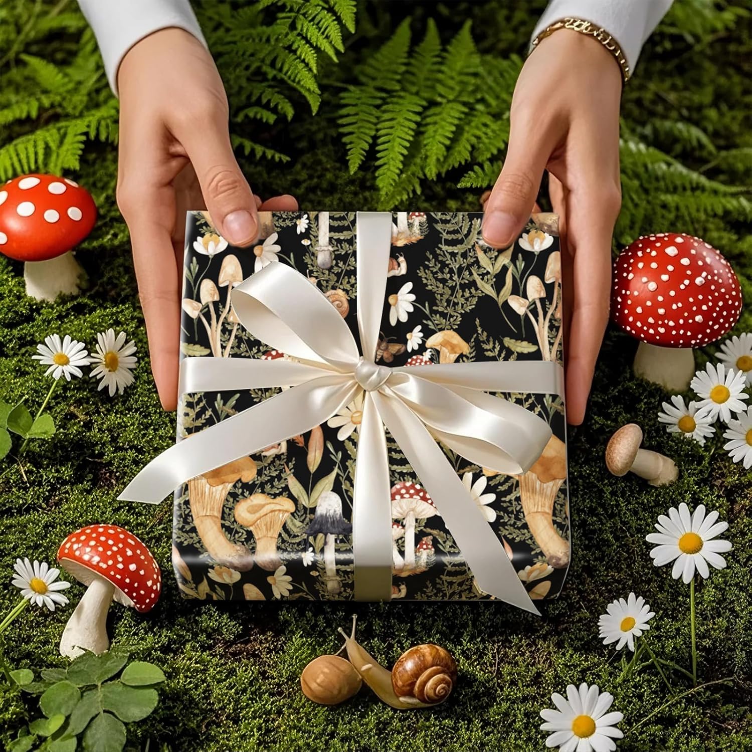 RUSPEPA Forest Mushroom Wrapping Paper Roll, Mini Roll, Woodland Squirrel and Snail Design, Black Nature Gift Wrap for Fall, Birthday, Thanksgiving Party, 17 Inches x 16.4 Feet
