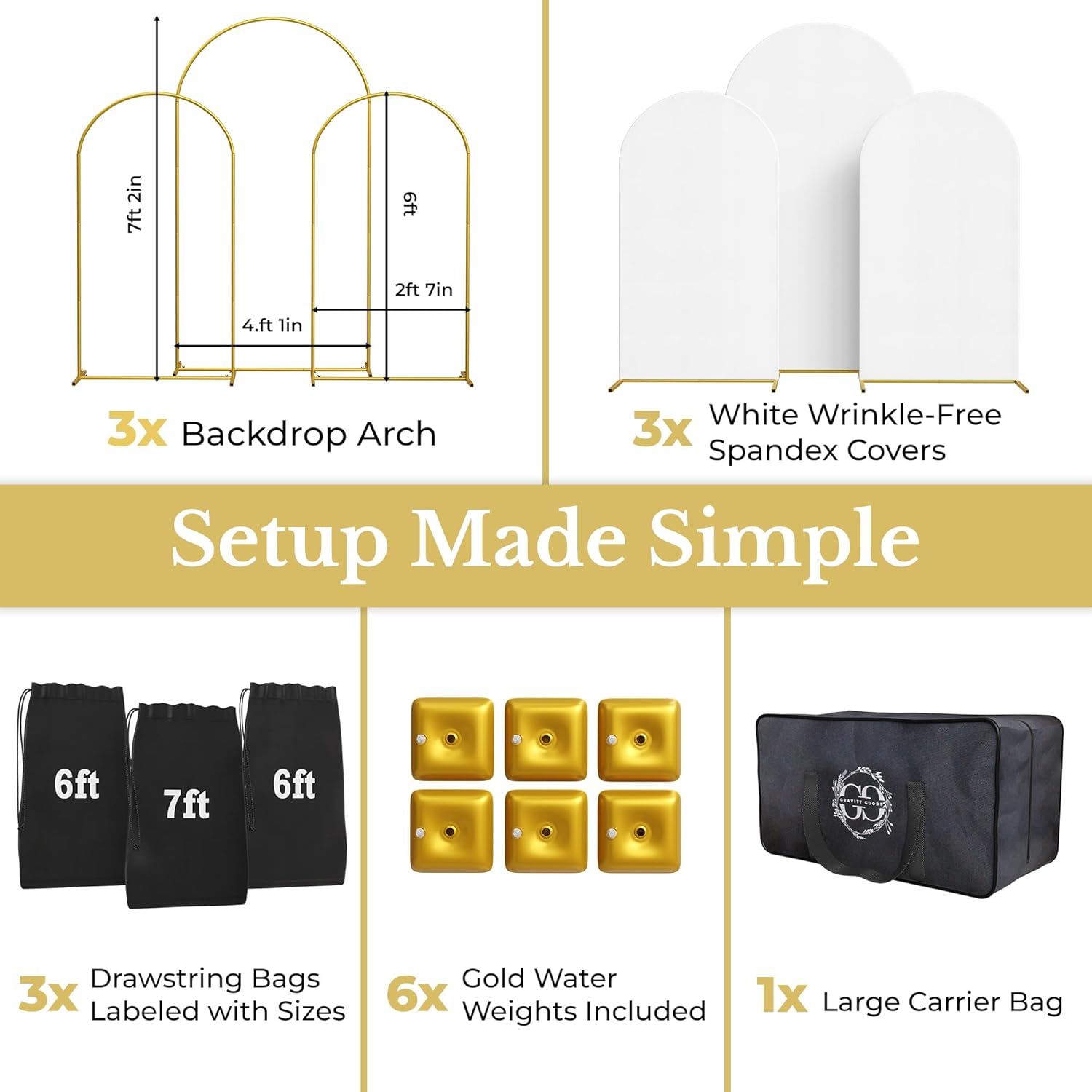 Metal Arch Backdrop Stand and Cover Set – 3 Gold Frames (7.2ft, 6ft x2) with White Wrinkle-Free Spandex Covers, Water Weights, Bags & Case – Wedding, Birthday, Baby Shower, Party Decor