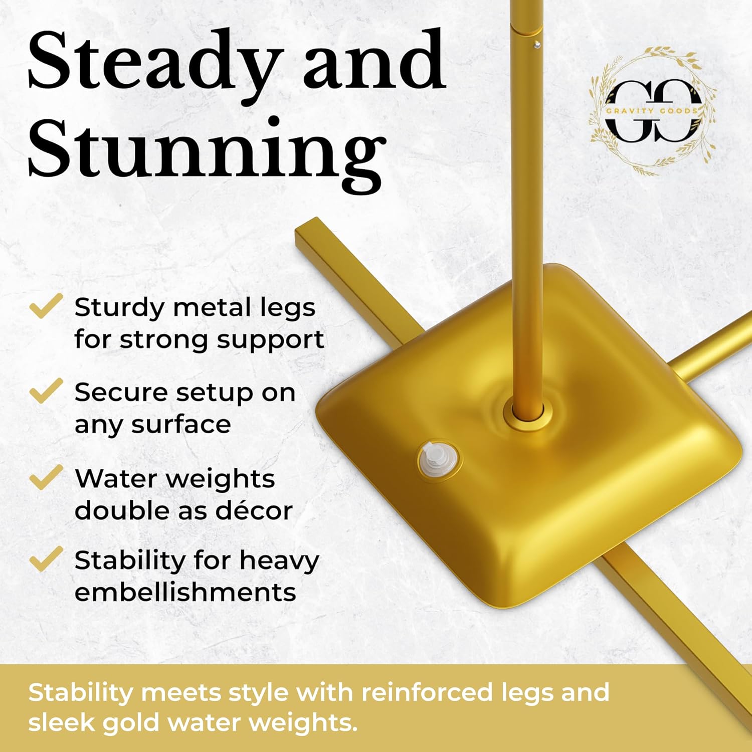 • STAY FOCUSED ON CELEBRATIONS & not on wobbly metal wedding arch stand backdrop problems. The 6 gold water weights hold it steady during outdoor gusts or indoor setups. With a gold finish, there's no need to search for weights that match your elegant design