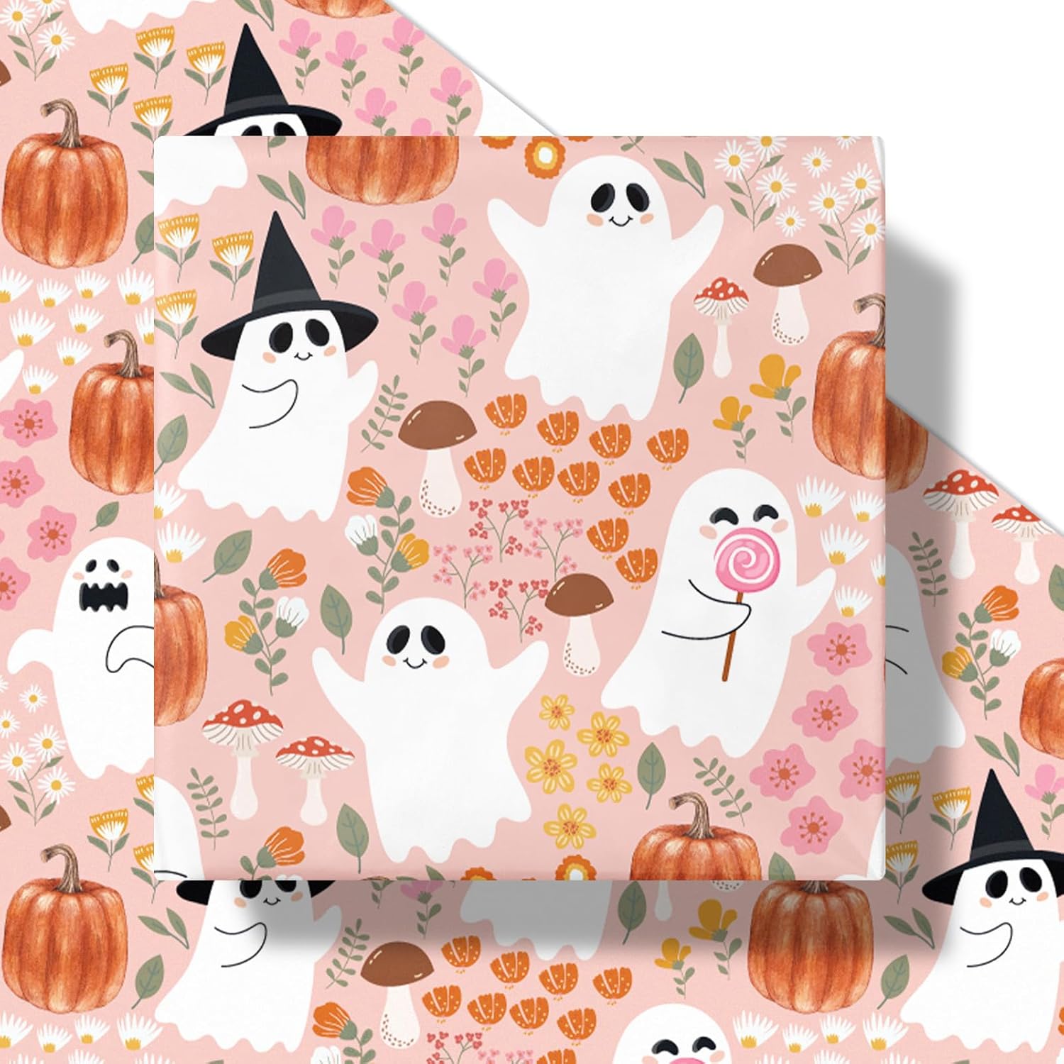 • Adorable Halloween Design: Features smiling ghosts, pumpkins, mushrooms, fall flowers, and witch hats on a soft pink background—perfect for a cute and cozy Halloween look.