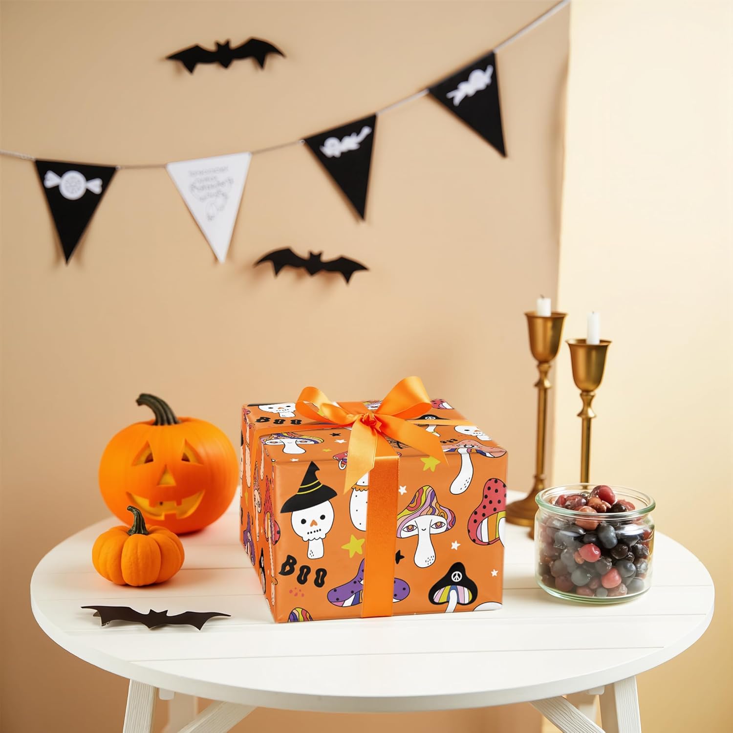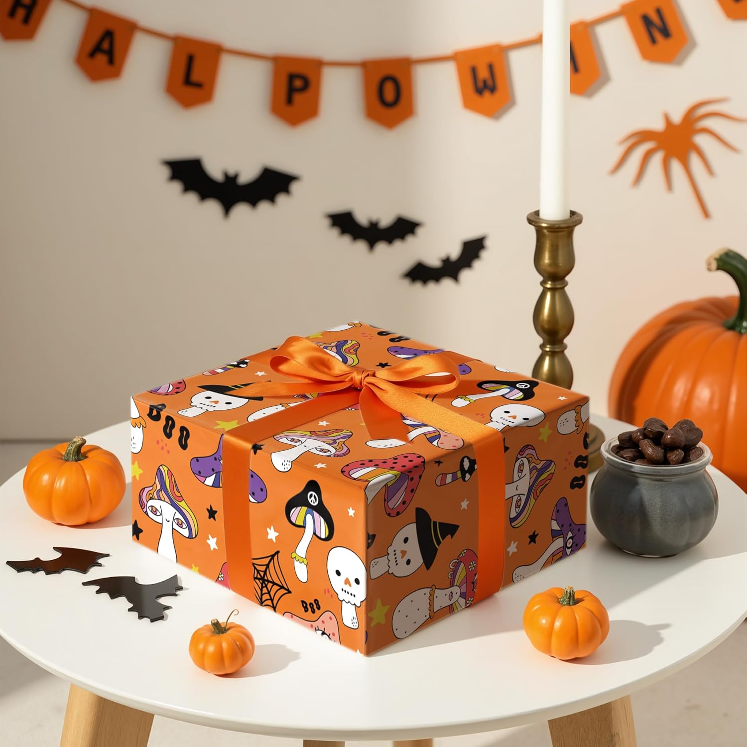 • Halloween Creepy Mushroom Wrapping Paper: Features colorful mushrooms with eyes, skull heads, peace signs, witch hats, spider webs, stars, and “BOO” text on a bold orange background—perfect for a spooky and surreal vibe.