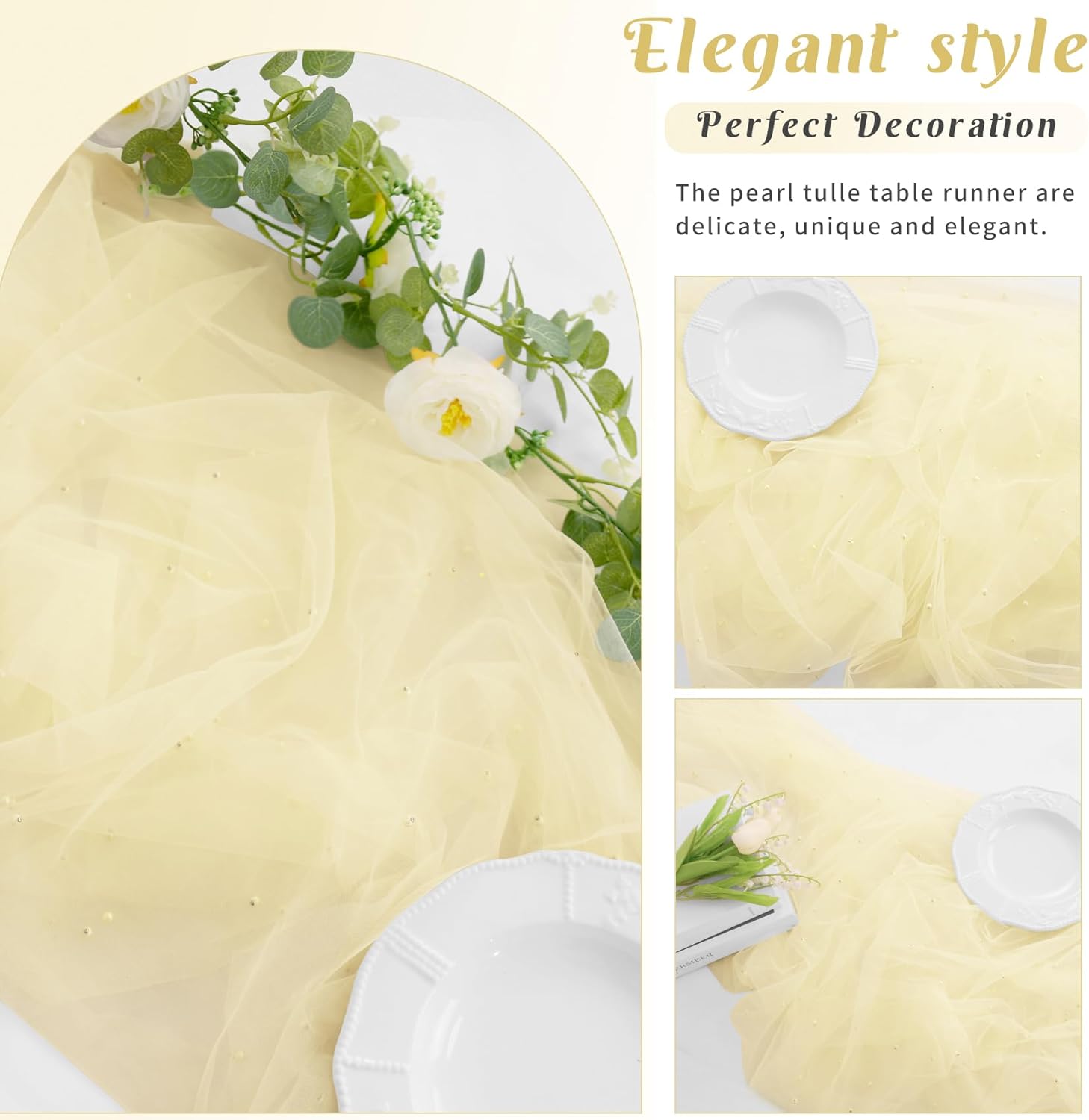 • 【Exquisite Workmanship】 These romantic table runners are made of premium tulle. Soft feeling, sheer, reusable, easy to clean and fade resistant. Delicate pearls embellished table runner works perfectly for many types of event decor, which will add a ton of elegance to any space.