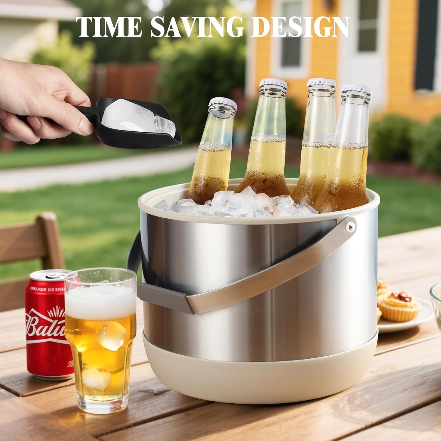 • 【4.8L Large Capacity & Upgrade Scoop】This large 162-oz ice bucket can hold 9 cans , perfect for a cocktail party. Say goodbye to the hassle of refilling small ice buckets every hour! It's perfect for cocktail bars, dinner parties, weddings, and backyard barbecues, and it reduces ice consumption by 50%. Our innovative ice scoop features a clean hanging design that hooks effortlessly onto your ice bucket. Enjoy ultimate portability as it travels attached, making it your ready companion for BBQs, camping and beach trips