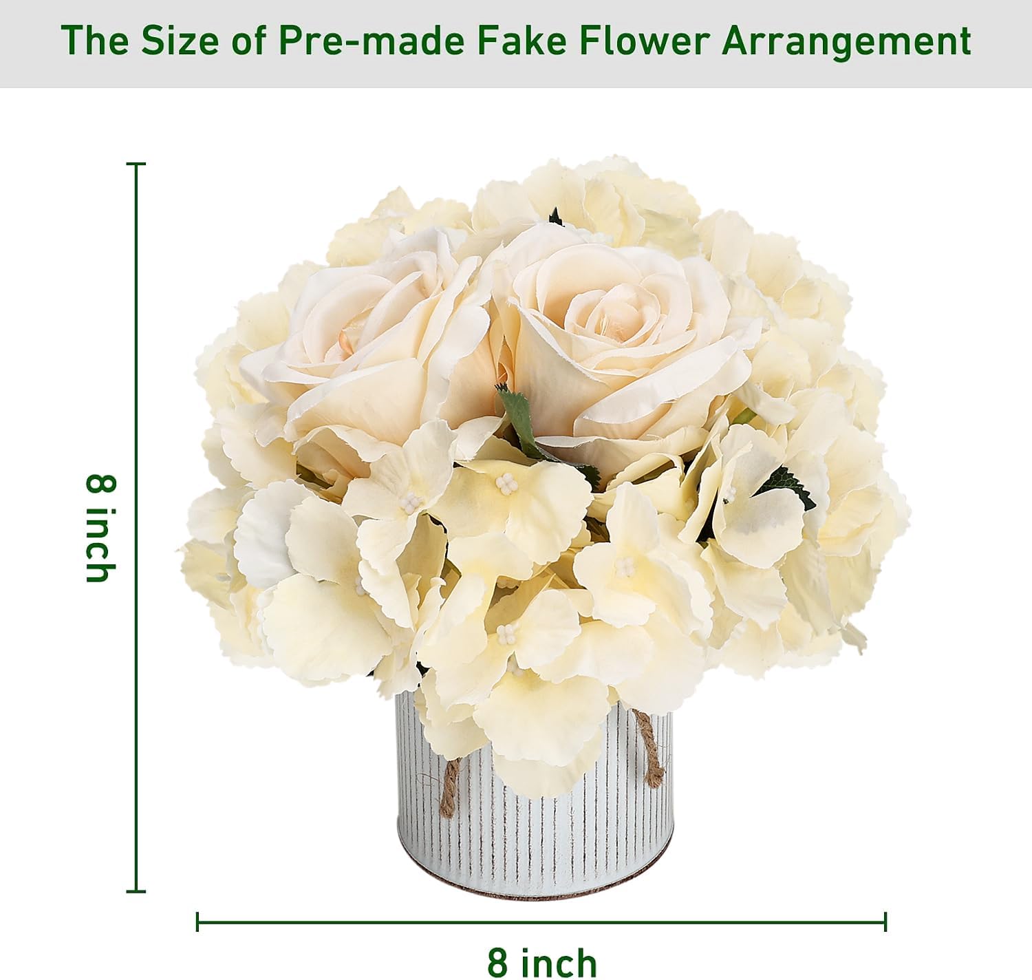 • Pack of 6 pre-made artificial flowers with rustic metal pot for table centerpieces. Consists of high quality champagne fake roses and faux hydrangeas.