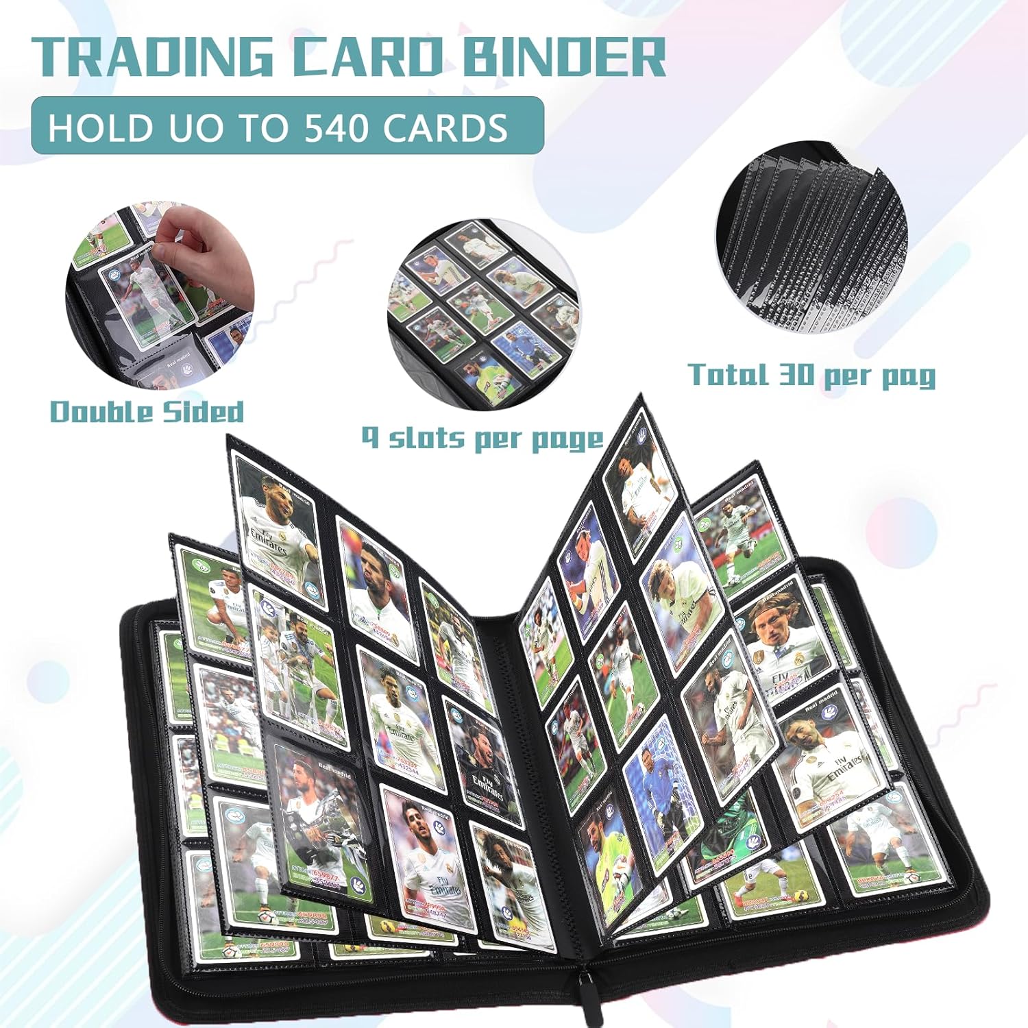 • LARGE CAPACITY CARD STORAGE:Smooth zippered card holder with 9 pockets per page,30 double sided pages hold up to 540 cards,providing plenty of space for card collectors and players to organize their cards