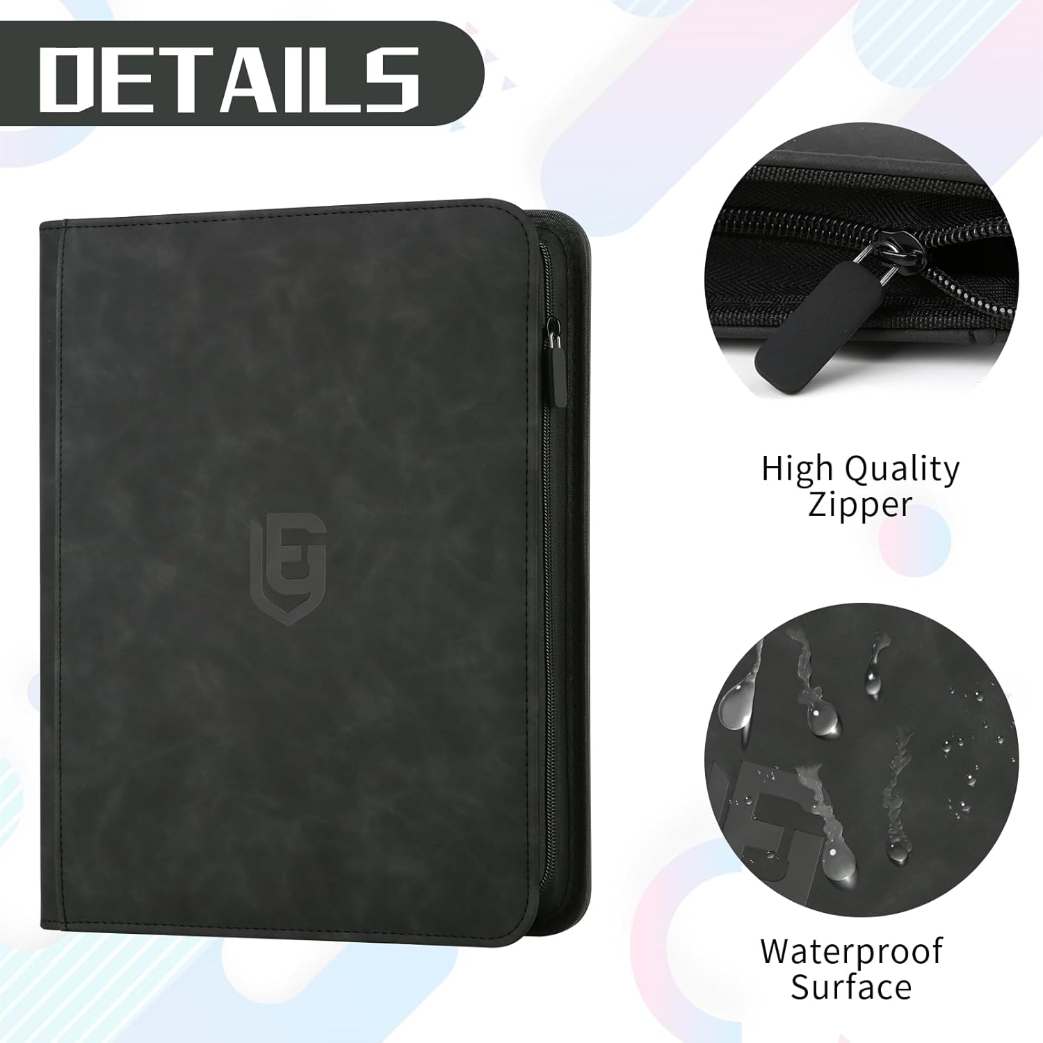 • DETAILED DESIGN:The card binder is made of premium PU leather, water or raindrops will not penetrate, different colors of the trading card binder with different colors of the zip, to meet your personalised needs. Side card pocket prevents cards from spilling out and protects your cards from fading and staining