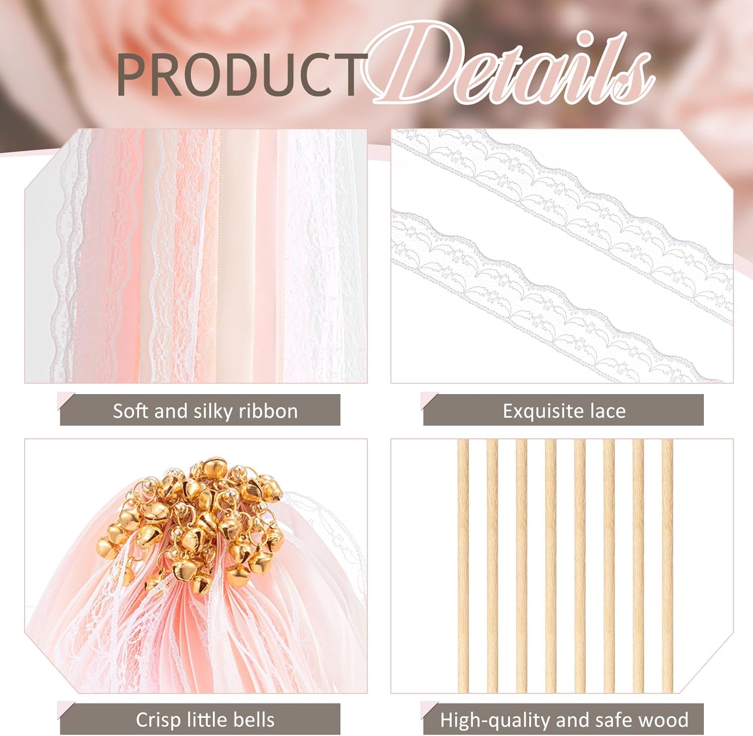 • Large Quantity: the package contains 150 pieces of wedding wands, with pink and beige ribbons, white lace, bells, enough for you to decorate an impressive wedding or party; You can also share them with your family and mates