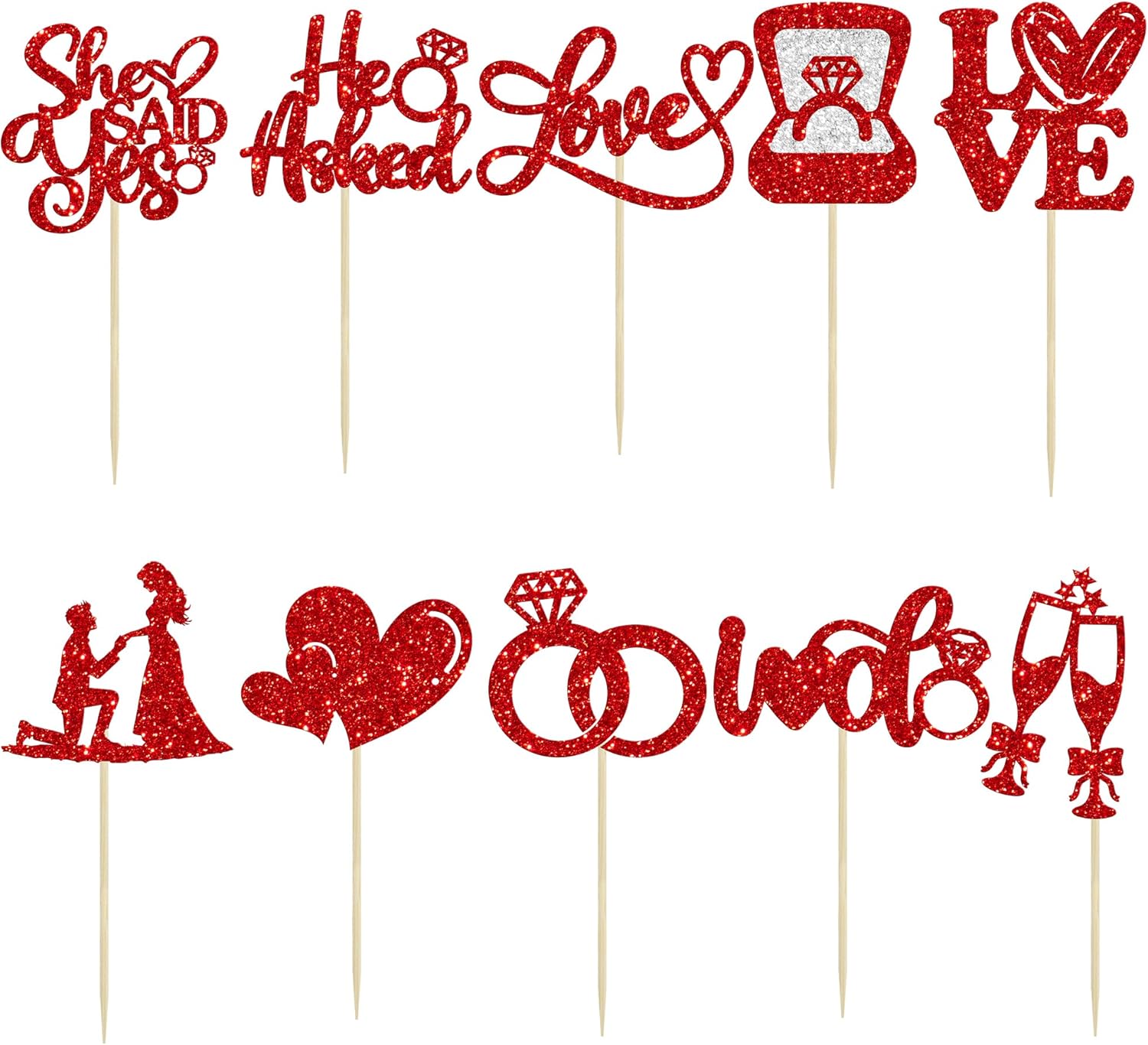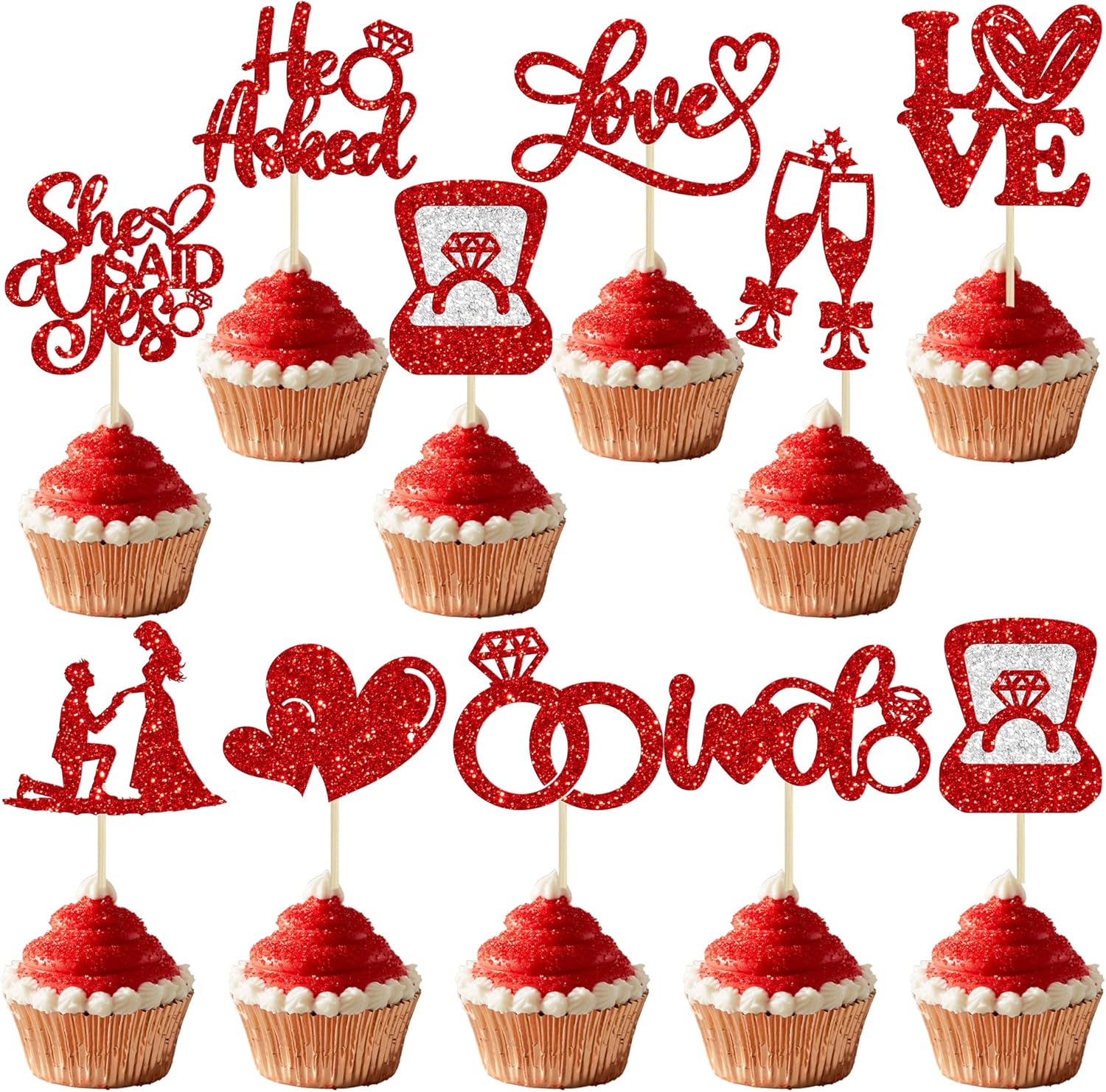 Ephlyn 30Pcs He Asked She Said Yes Cupcake Toppers Glitter Engagement Cupcake Toppers Diamond Ring Heart Love I Do Cupcake Picks for Engagement Wedding Party Cake Decorations Red