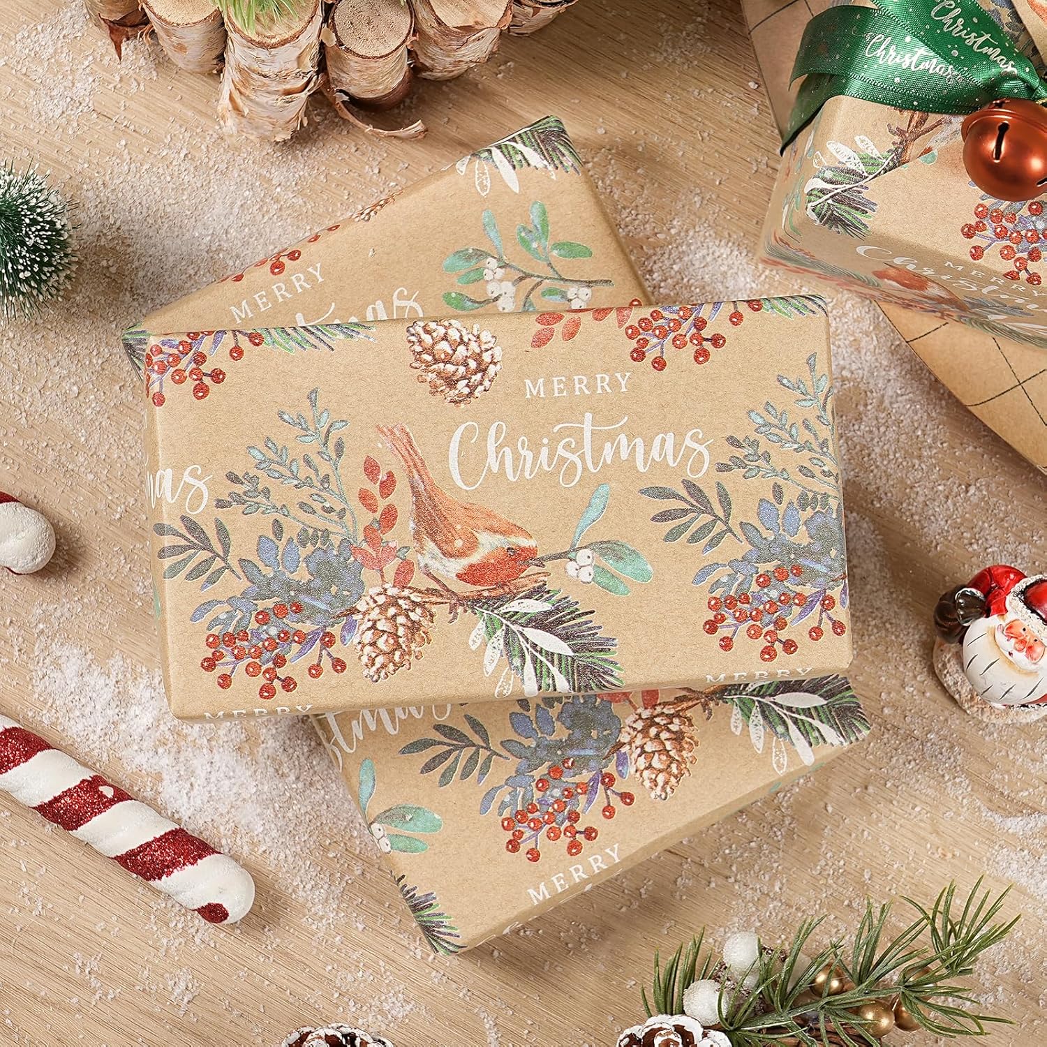 • Holiday Bird Design: Features a charming watercolor-style robin perched on pine branches with red berries, pinecones and snowy foliage. The soft, natural color palette adds a nostalgic and heartwarming feel to your holiday wrapping