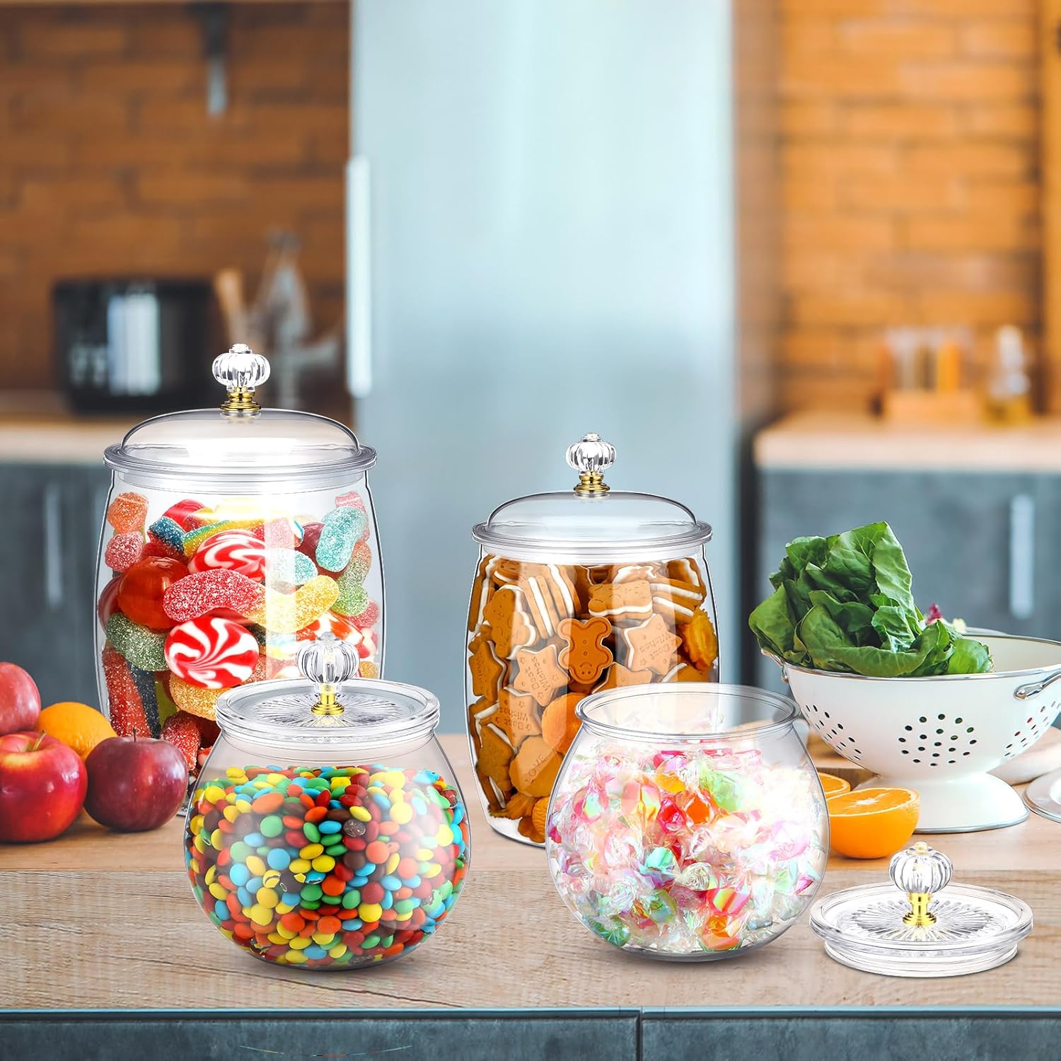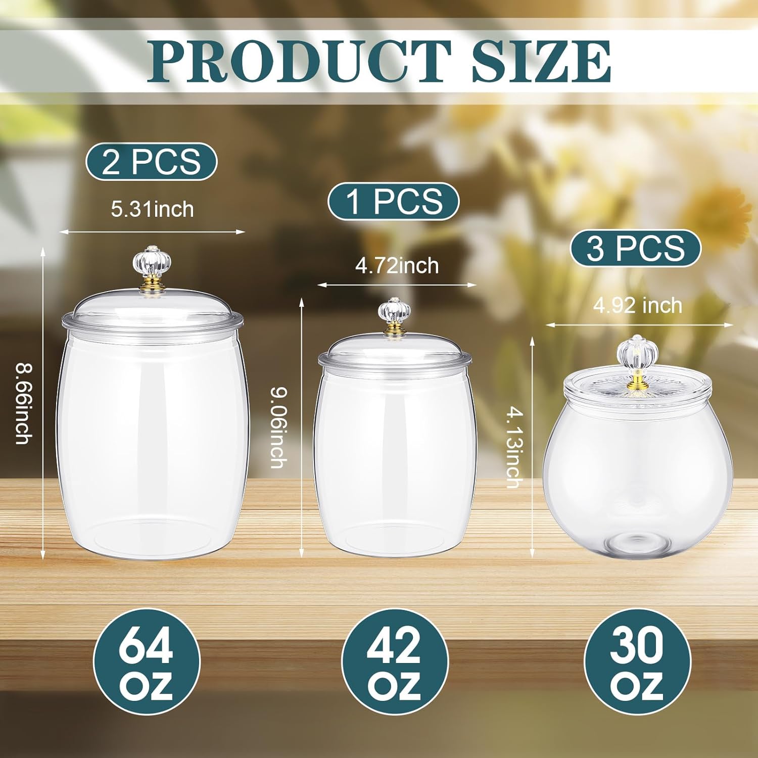 • Size and Capacity: the brilliant design of these plastic candy jars boasts a size of about 64 oz, 42 oz, 30 oz in capacity; This space saving feature enables you to store up to kinds of your favorite sweets or snacks, fitting well on your kitchen counter or dining table