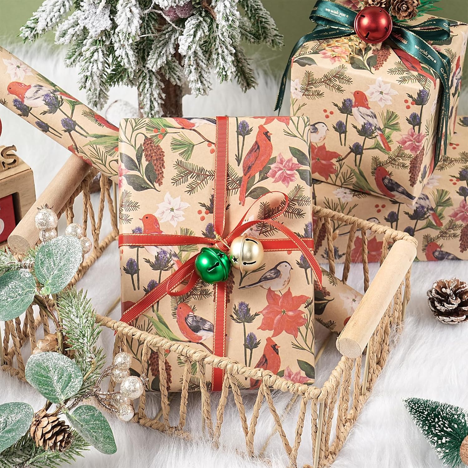 RUSPEPA Kraft Christmas Wrapping Paper Roll, Mini Roll, Watercolor Bird and Botanical Design with Flowers & Pinecones, Kraft Gift Wrap for Women, Friends, Holiday, Winter Party, 17 Inches x 16.4 Feet