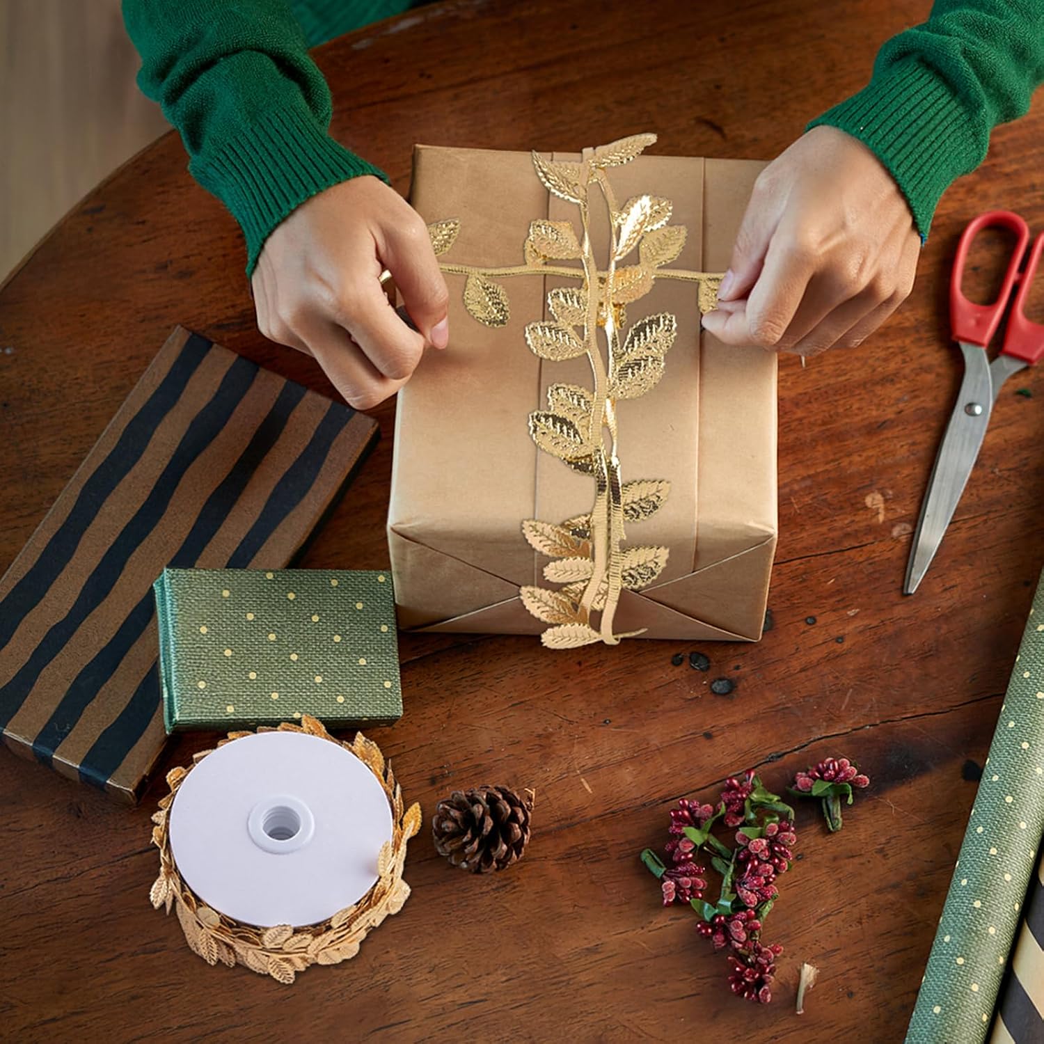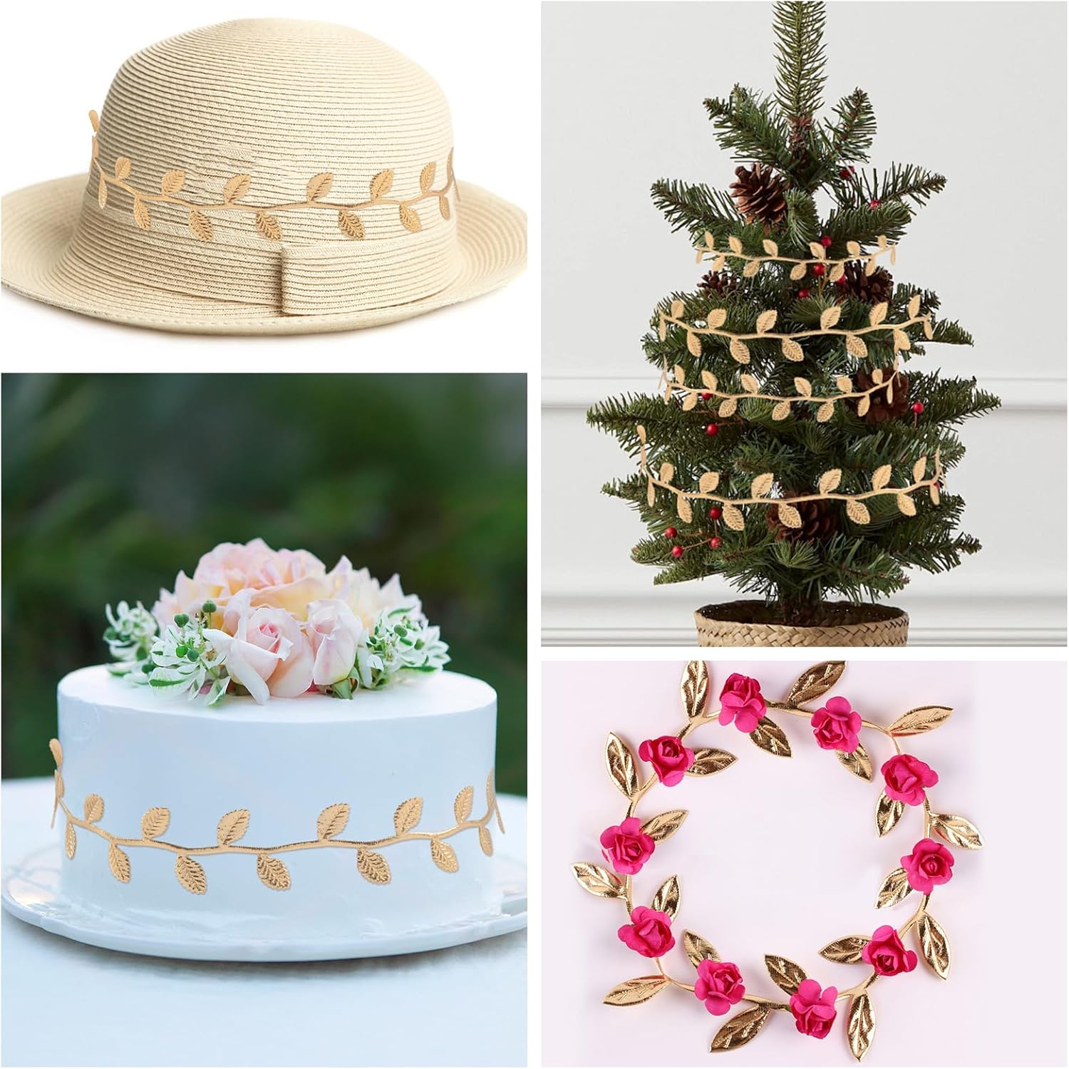 • SHINY GOLD LEAF RIBBON DESIGN:Artificial Gold Leaf Ribbon Features Clear Leaf Texture On Both Sides,Golden Leaves Ribbon Has The Beauty, Sturdiness,Shiny Gold Leaf Trim Will Make Your Project Very Tasteful With Beautiful Shades.