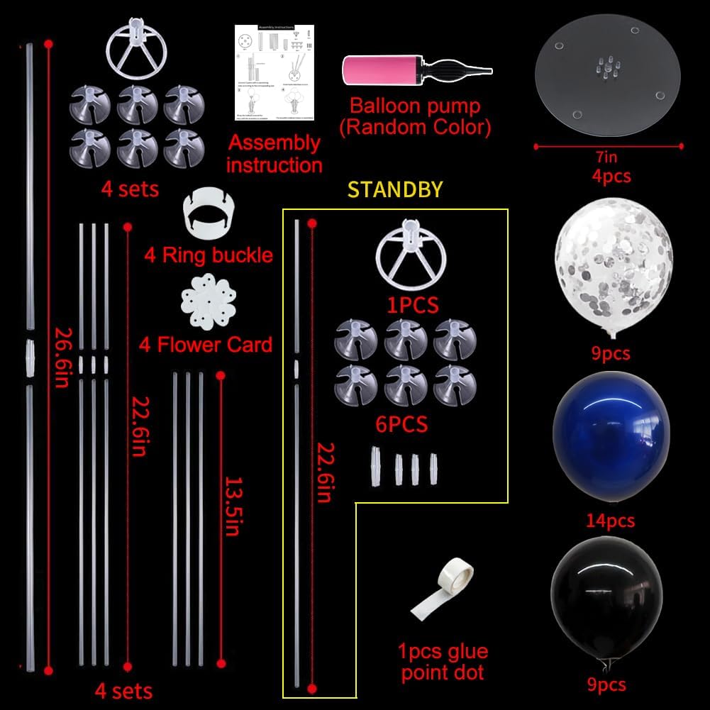 • Package Includes: The balloon arch kit includes 4 reusable balloon centerpiece table decorations and 12inch 32 pcs Latex Balloons (14 dark blue balloons,9 black balloons,9 silver confetti balloons),glue point dots,balloon pump,balloon clips,and tie tool.You don’t need to waste money to buy balloons