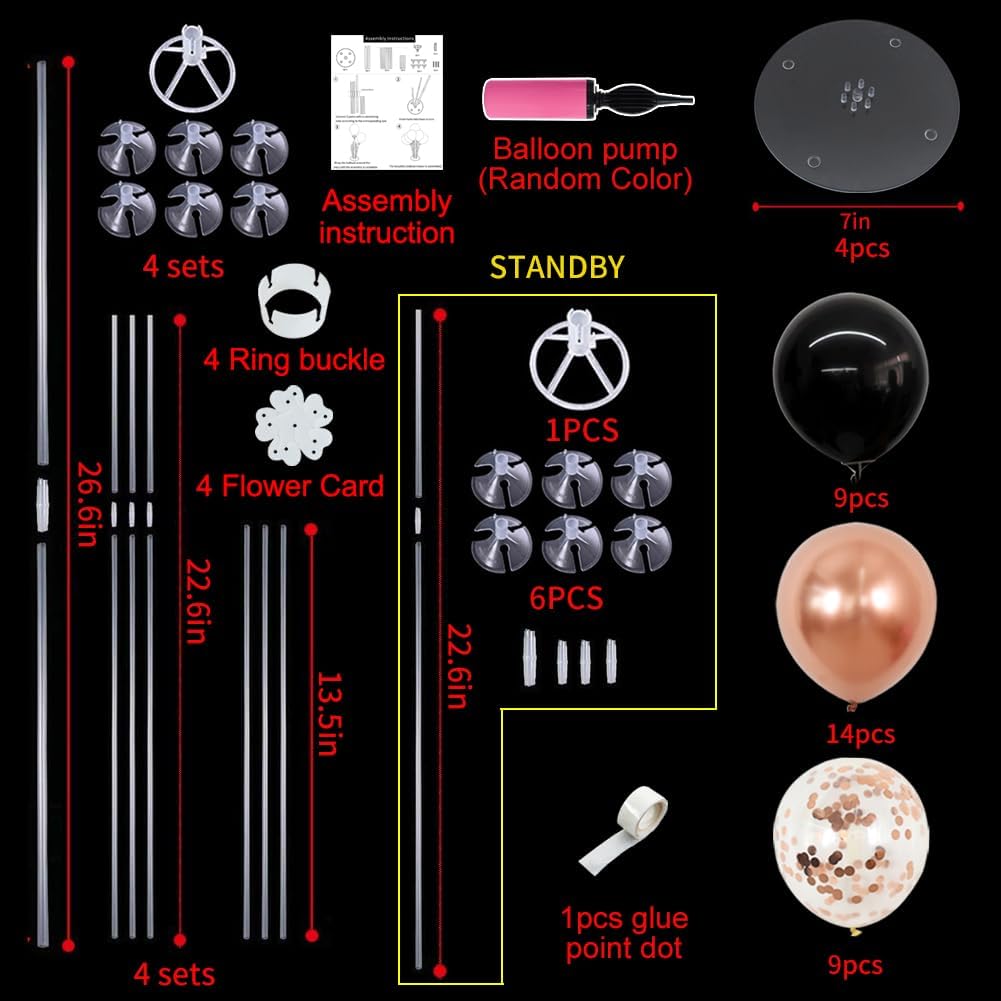 • Package Includes: The balloon arch kit includes 4 reusable balloon centerpiece table decorations and 12inch 32 pcs Latex Balloons (14 rose gold balloons,9 black balloons,9 rose gold confetti balloons),glue point dots,balloon pump,balloon clips,and tie tool.You don’t need to waste money to buy balloons