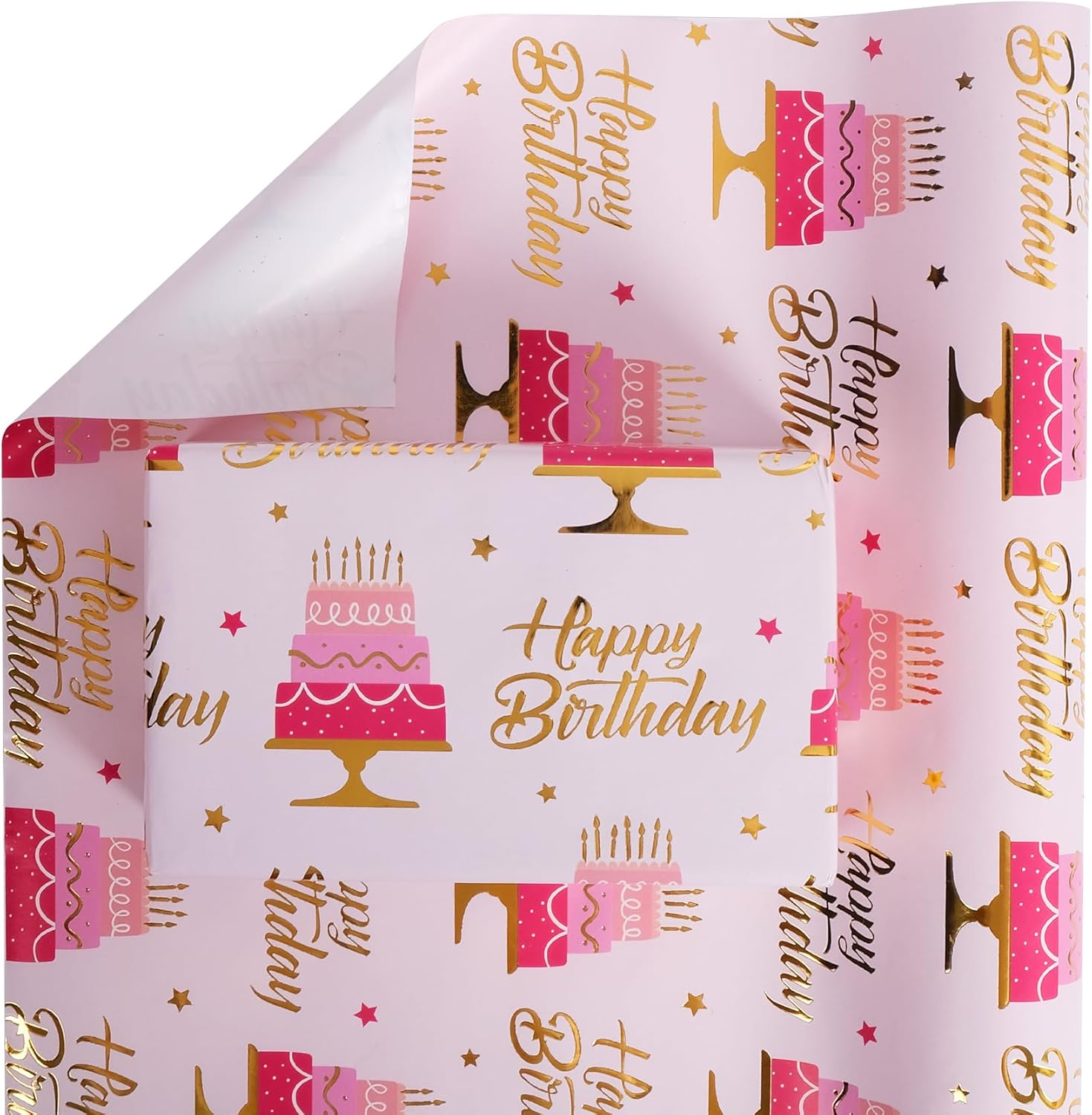 Aimyoo Pink Birthday Wrapping Paper Roll - 17 Inch X 32.8 Feet - Gold Foil Celebration Cake, Happy Birthday Lettering Design Gift Wrap for Kids, Baby Showers