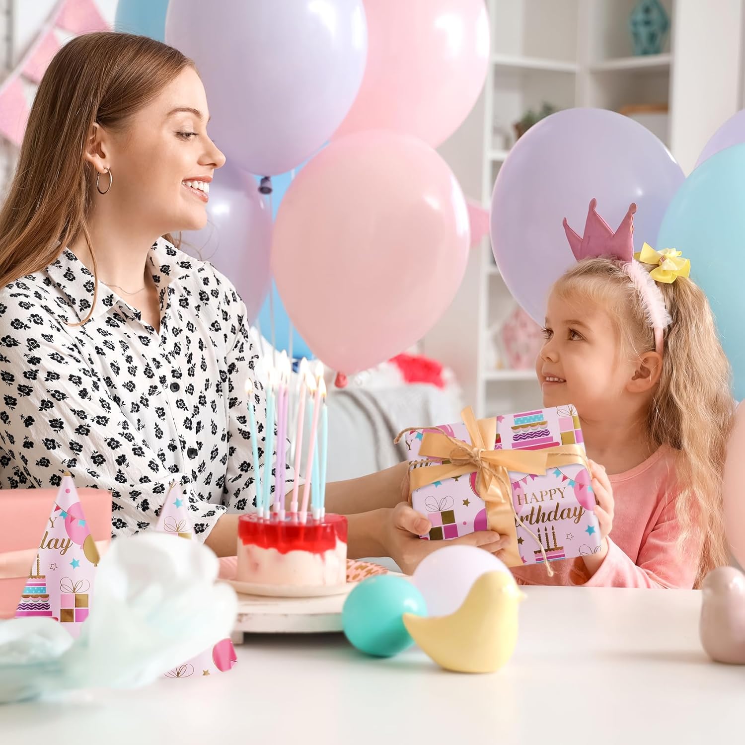 Aimyoo Pink Birthday Wrapping Paper Roll - 17 Inch X 32.8 Feet - Gold Foil Celebration Cake, Balloon, Happy Birthday Lettering Design Gift Wrap for Kids, Baby Showers