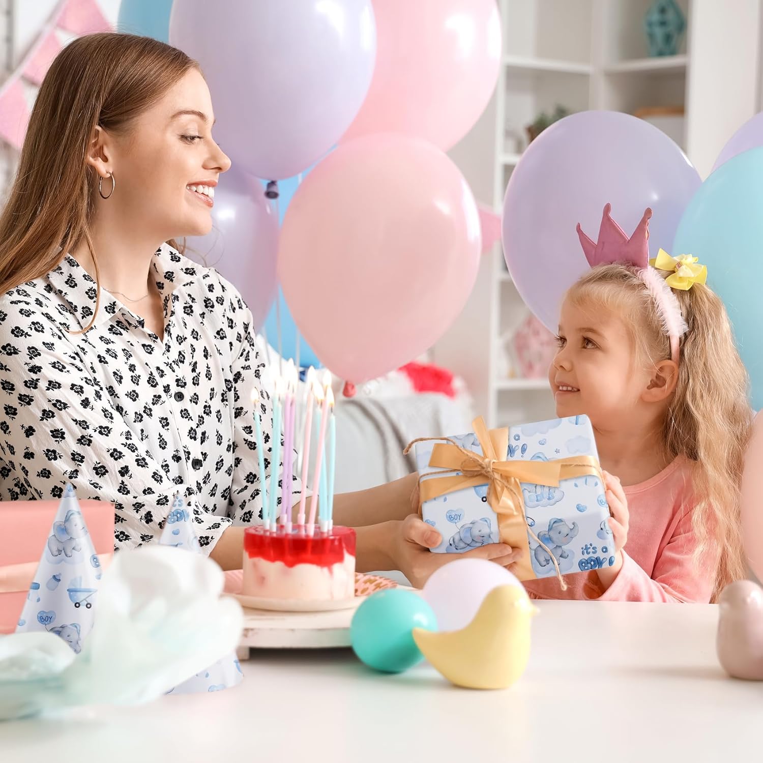 • Cute Baby Shower Design: The baby boy wrapping paper features charming blue elephant and cloud patterns, making it perfect for any baby shower celebration or birthday party for boys