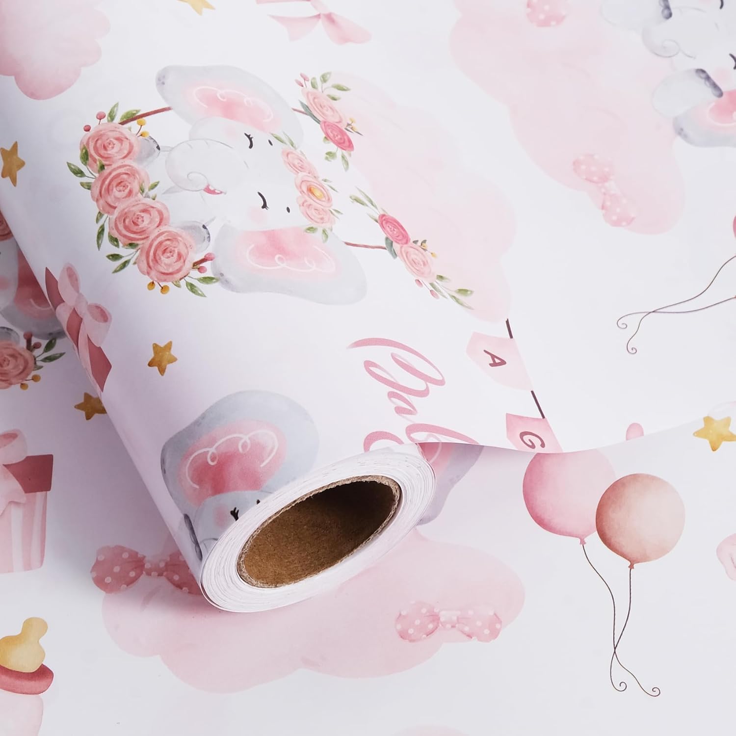 • Cute Baby Shower Design: The baby girl wrapping paper features charming pink elephant and cloud patterns, making it perfect for any baby shower celebration or birthday party for girls