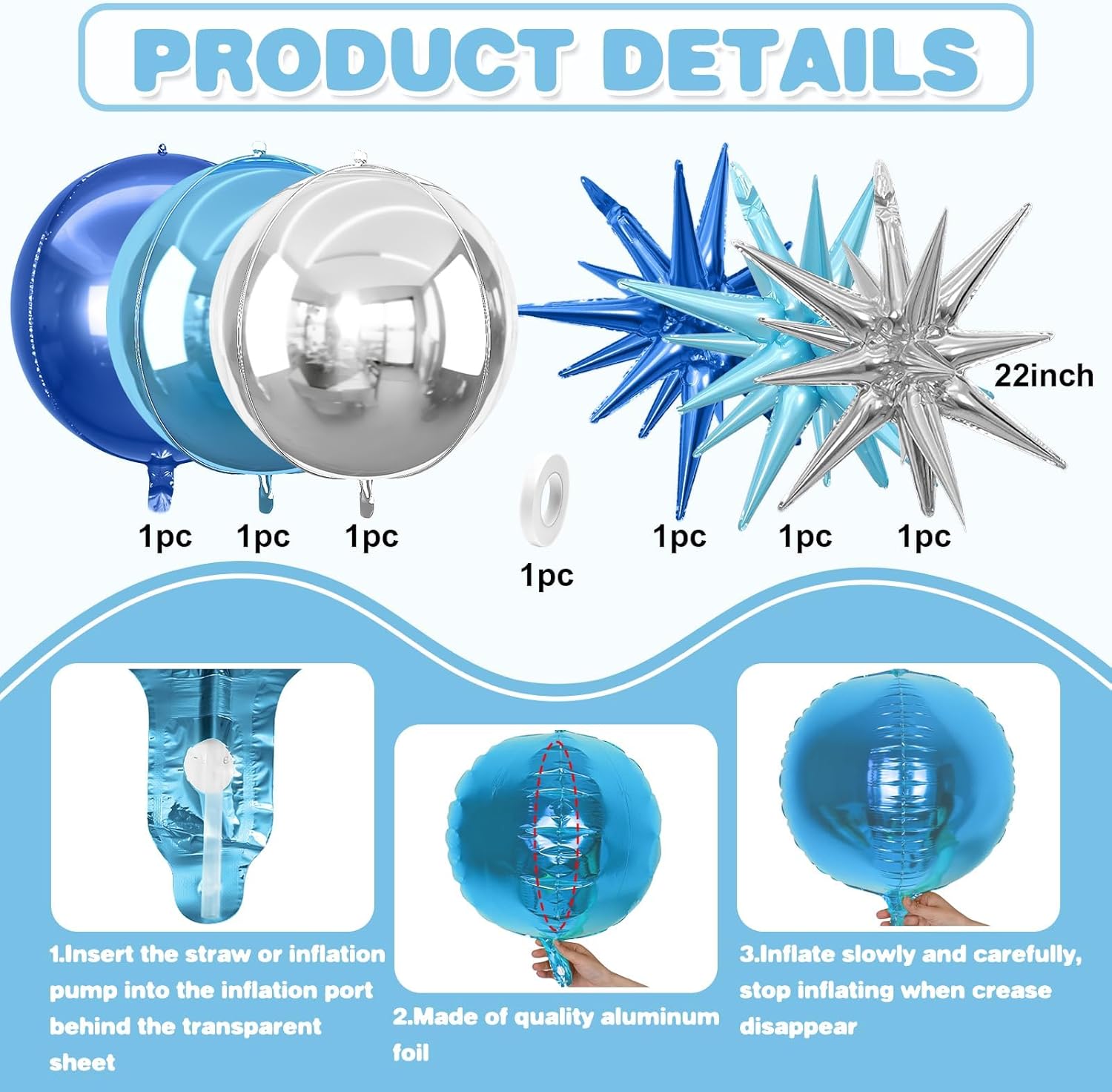 • 【Easy Use】Our blue and silver foil balloons are easy to inflate. The straw inside the package can help you inflate the balloon. After inflation, you can pinch your fingers to the position of the inflation to automatically seal it.