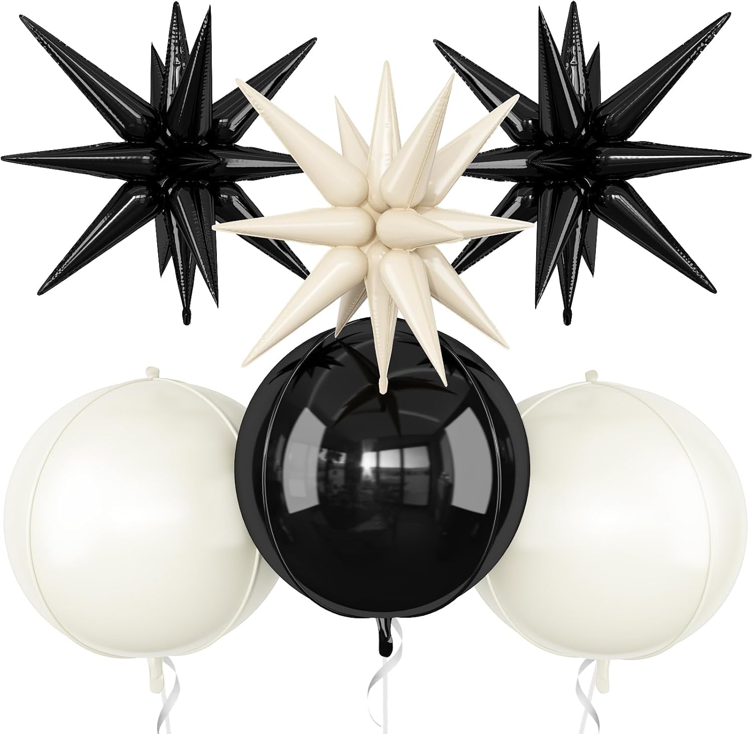 6Pcs Black White Foil Balloons,22Inch Sand White Black 4D Round Ball Balloon and Explosion Star Balloon for Birthday Wedding Baby Shower Anniversary Decorations