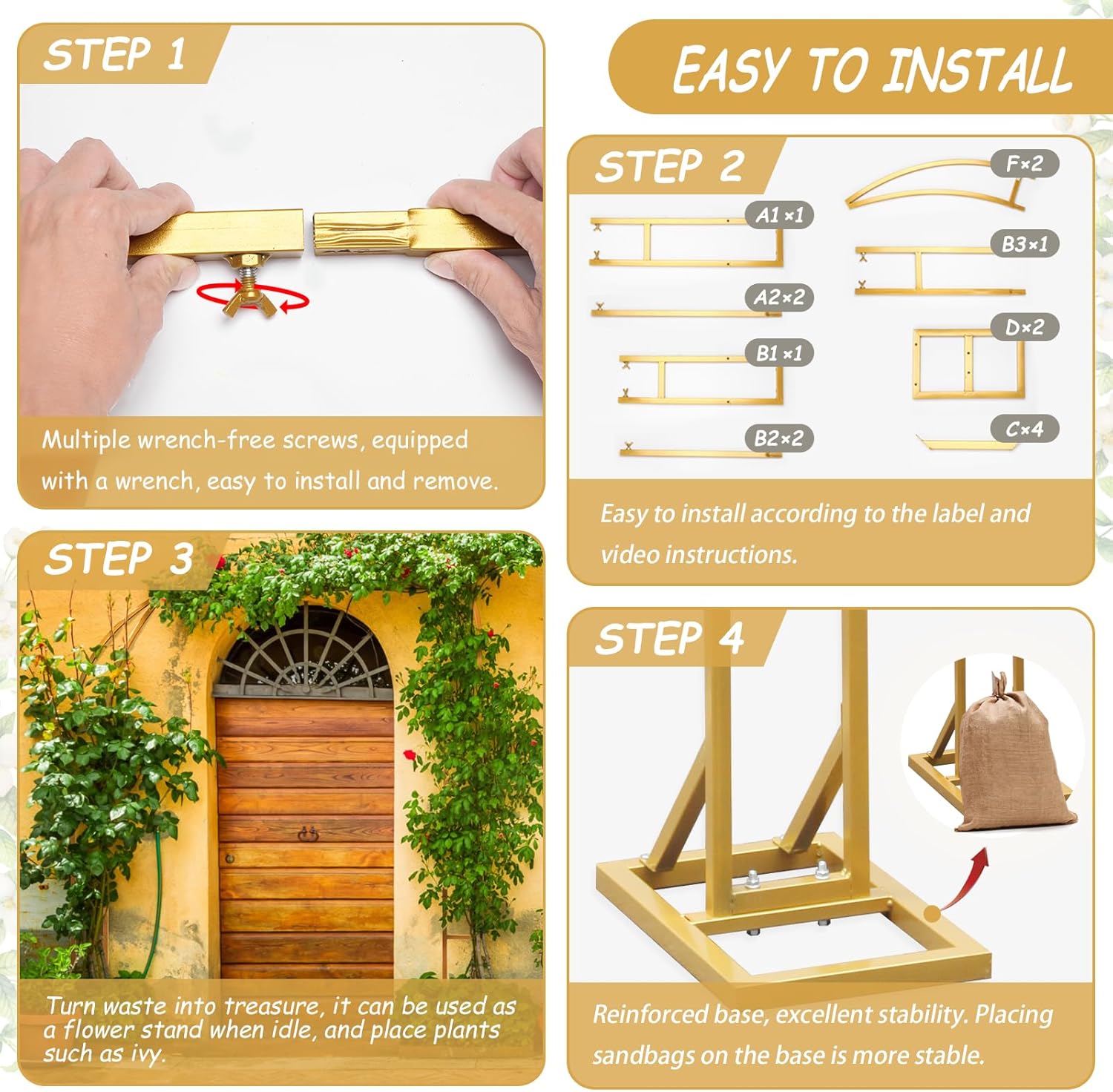 • 【Elegant & Sturdy Wedding Arch 】: The Curved wedding arch frame is made of high-quality metal by die-casting, polishing, spraying, and other processes, strong, sturdy, and not easy to deform. The shiny golden powder coated on the surface prolongs service life anti-rust and corrosion-resistant. It's perfect as a wedding arch, balloon arch stand, or garden arch for gardens displaying beautiful climbing plants like vines and roses,and suitable for both indoor and outdoor events.