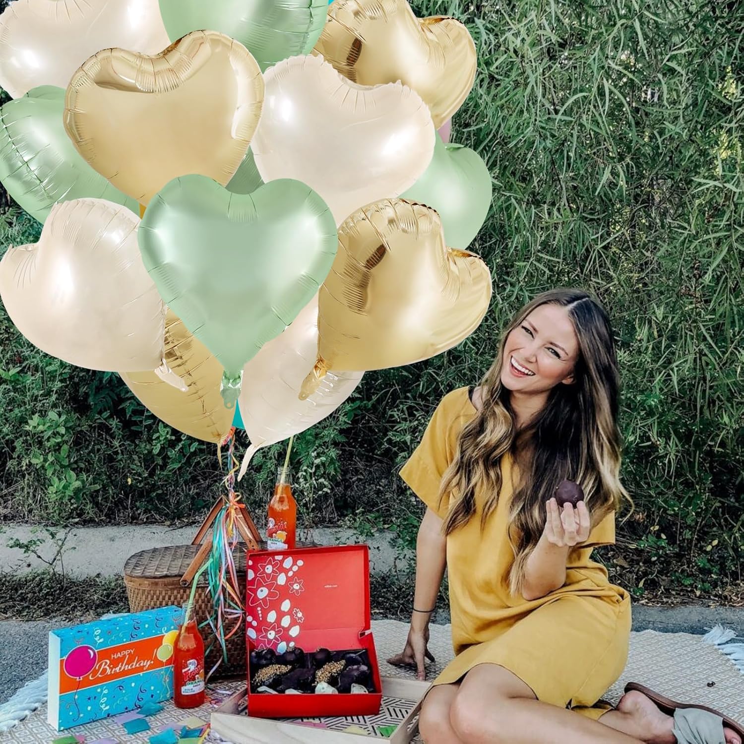 TONIFUL 15Pcs Sage Green Gold Heart Balloons 18 Inch Green Cream White Heart Shape Foil Mylar Balloons Decoration for Jungle Woodland Birthday Party Baby Shower Supplies