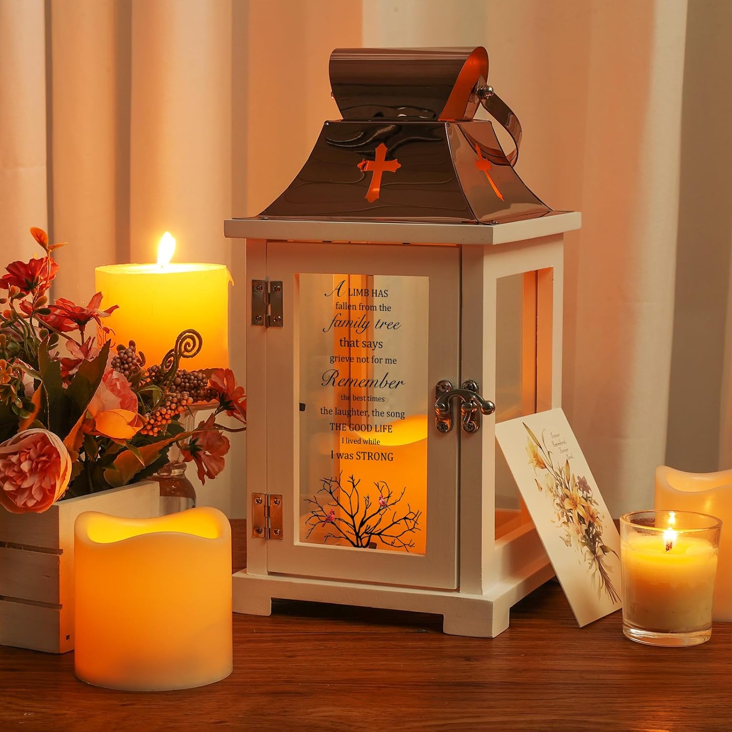 • Sympathy Gifts: Memorial lanterns are a thoughtful sympathy gift that can provide comfort and solace to those grieving the loss of loved one. The flickering flameless candle light in the lantern represents the enduring presence of a loved one, offering hope and comfort to those grieving. Even though loved ones are no longer physically present, their spirit and memory continue to light up our lives.