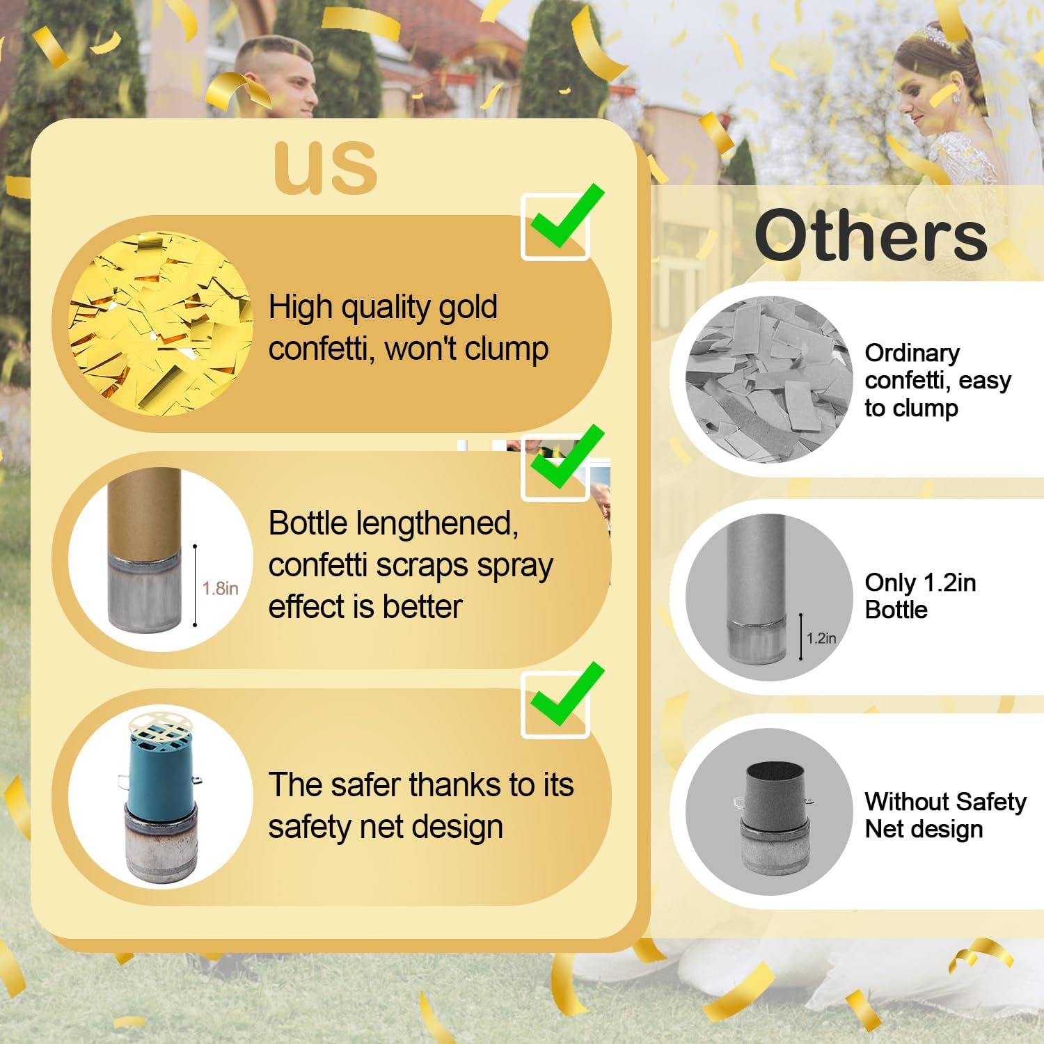 • Easy to use: these confetti cannons are powered by a compressed air unit and are simple to operate, just peel off the seal, hold the center and bottom, straighten your arm is the confetti cannon is perpendicular to the ground, rotate it in the direction of the arrow, and then release the dazzling golden confetti. Perfect for creating a festive atmosphere in seconds!