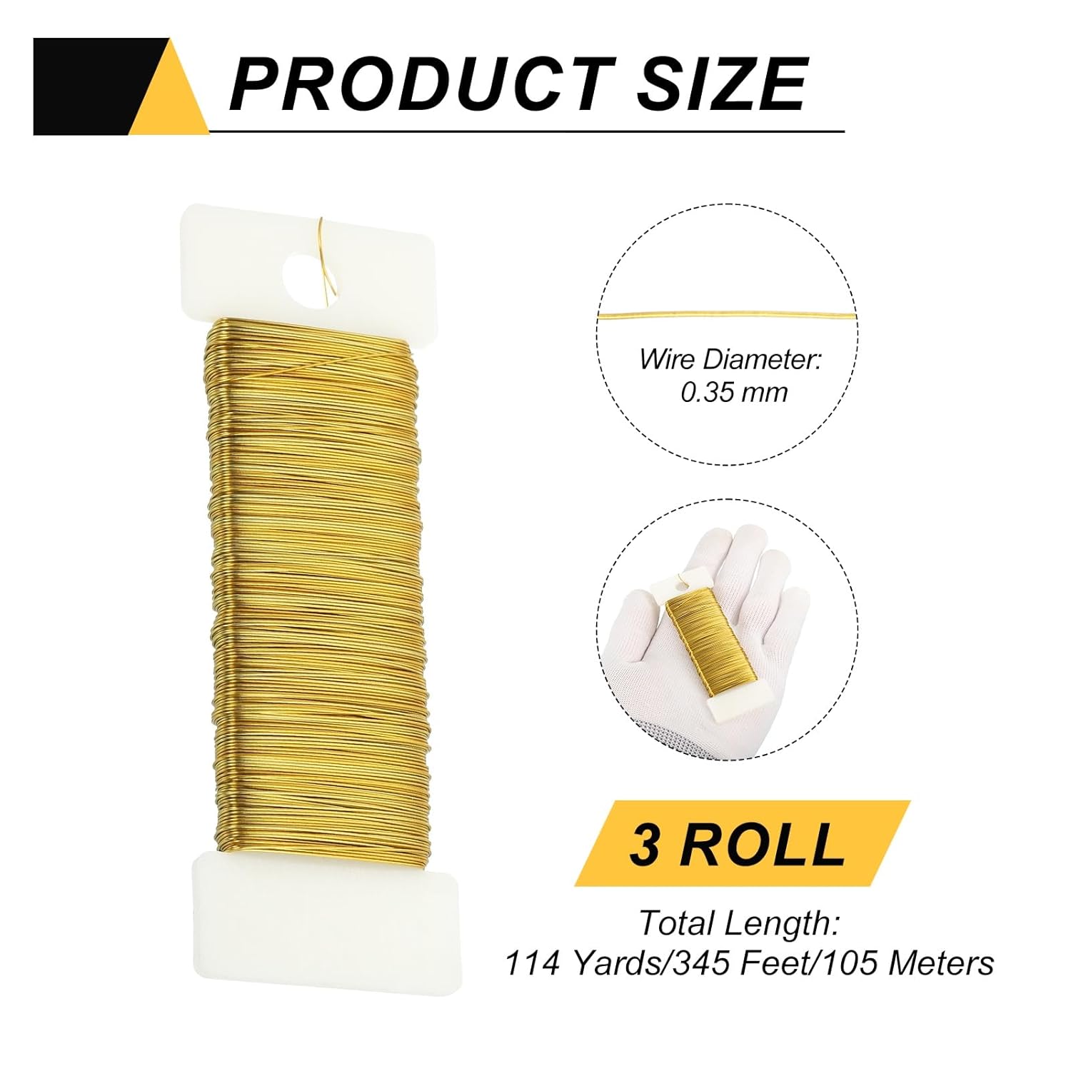 • Color: Gold Tone; Material: Aluminum; Total Length: 114 Yards/345 Feet/105 Meters; Diameter: 0.35mm/27 Gauge; In the package of: 3 Roll Metal Floral Wire (38 Yards/ Roll)