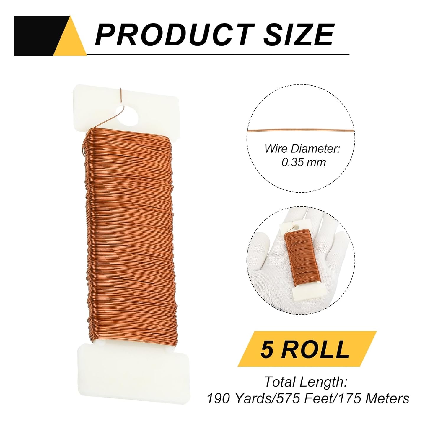 • Color: Copper; Material: Aluminum; Total Length: 190 Yards/575 Feet/175 Meters; Diameter: 0.35mm/27 Gauge; In the package of: 5 Roll Metal Floral Wire (38 Yards/ Roll)