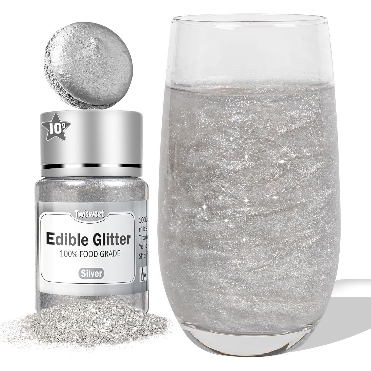 Twisweet Silver Edible Glitter for Drinks, Food Grade 10g Sparkling Sprinkles Cake Decorating Supplies, Edible Luster Dust for Cocktail Beverages, Food Coloring Shimmer Powder for Cupcakes Cookies Cake Decorations