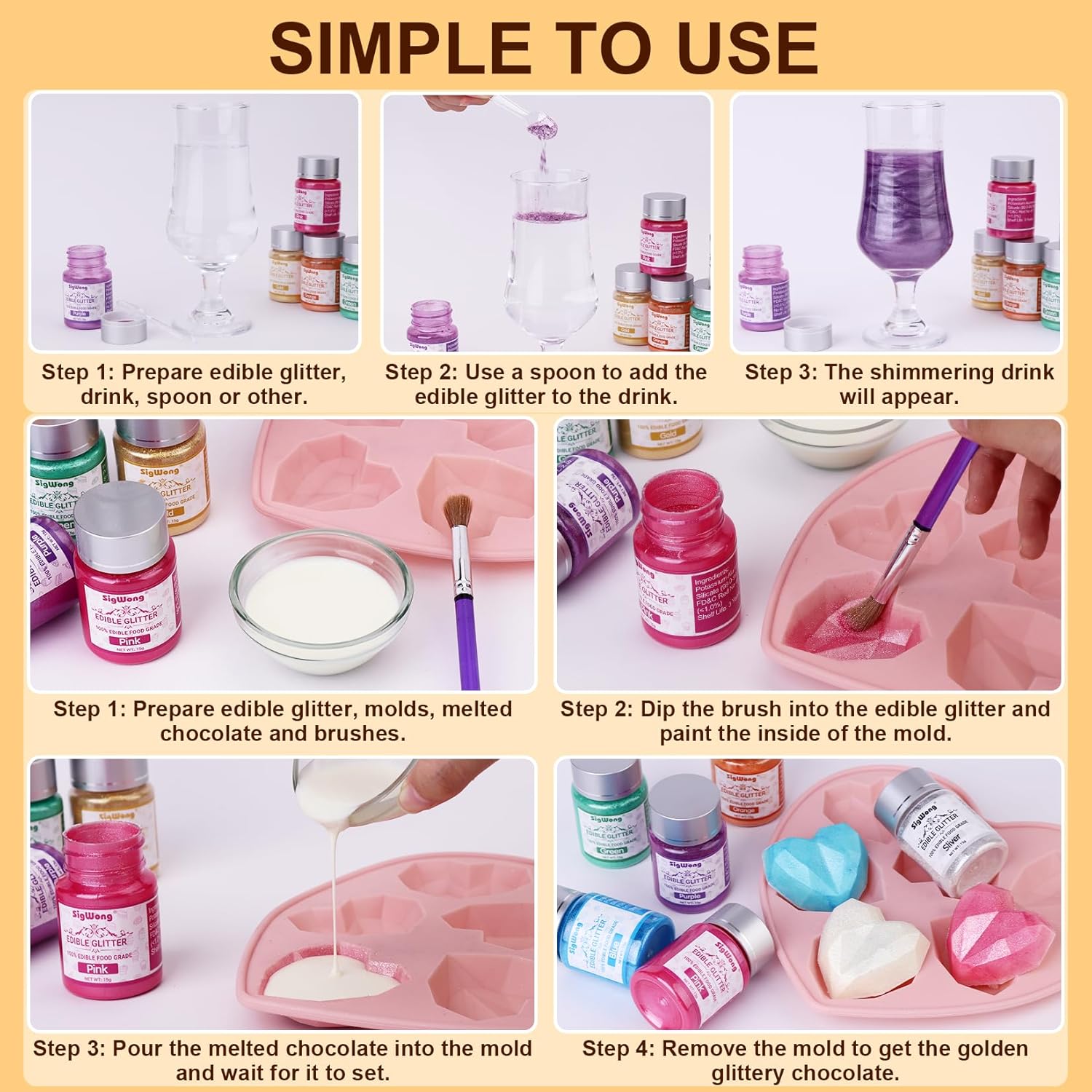 • Easy to Use - You can mix the glitter directly with drinks can make a starlight drink, or sprinkle it directly on cakes or desserts to complete the decoration, or use a brush to apply it directly on molds and pour it into chocolate. Enjoy the fun of DIY desserts and drinks!