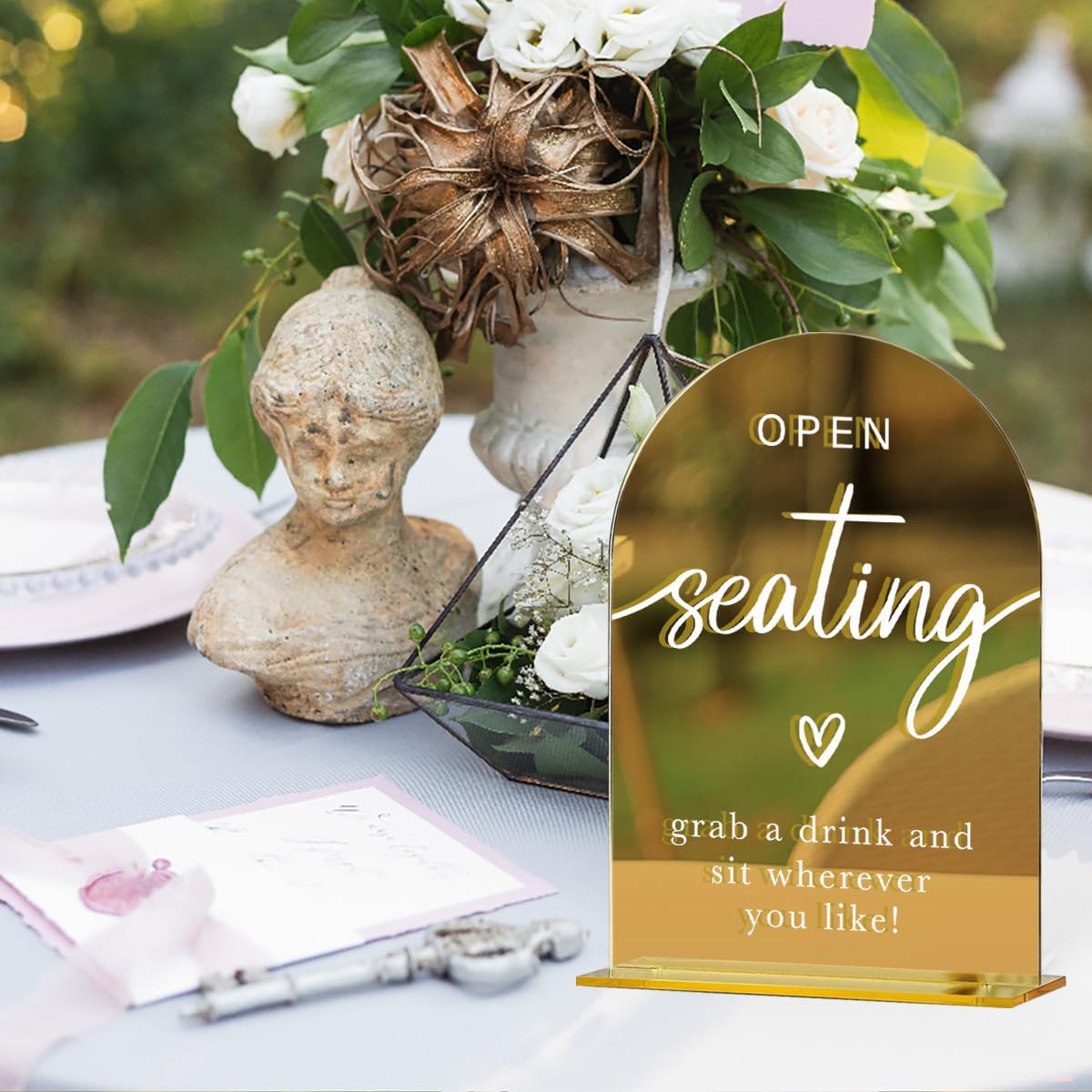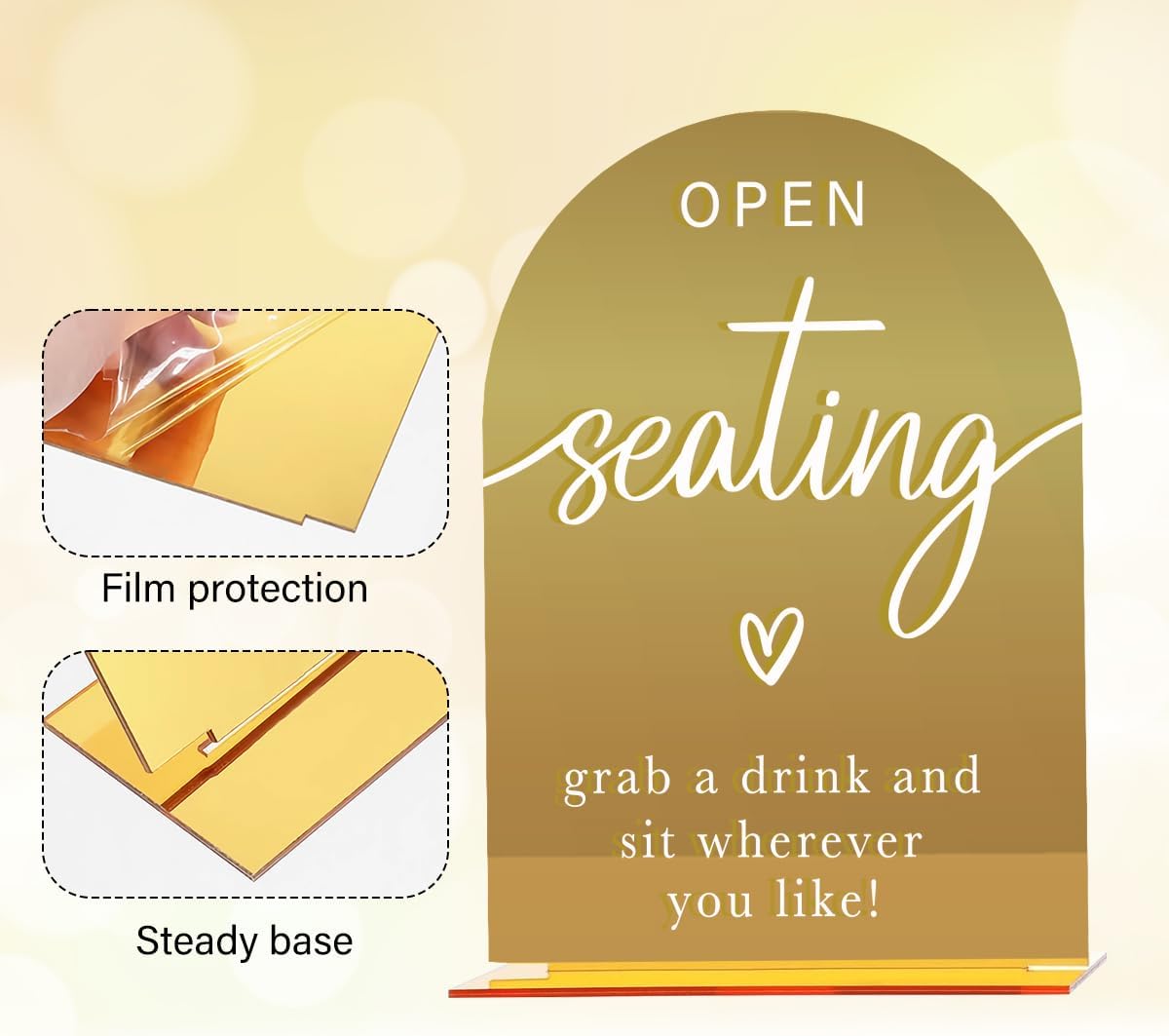 Acrylic Wedding Sign, Bridal Shower Decorations, Open Seating Sign for Ceremony, Modern Font Table Signs, Gold Mirror Arched Acrylic Tabletop Signs for Wedding Reception and Event Party