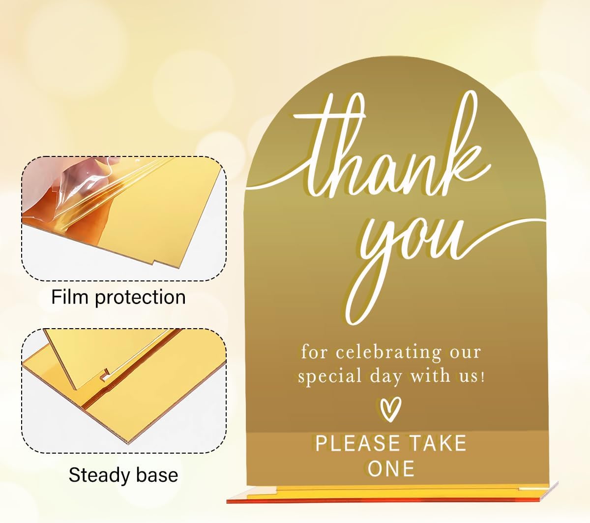 • 【Suitable Size】: Each wedding sign comes with a small acrylic base; the sign measures about 5 x 7 inches, and the acrylic base is about 4.3 x 1.2 inches. Each mirrored arch acrylic wedding sign has a protective film to prevent scratches, which should be torn off when ready to use.