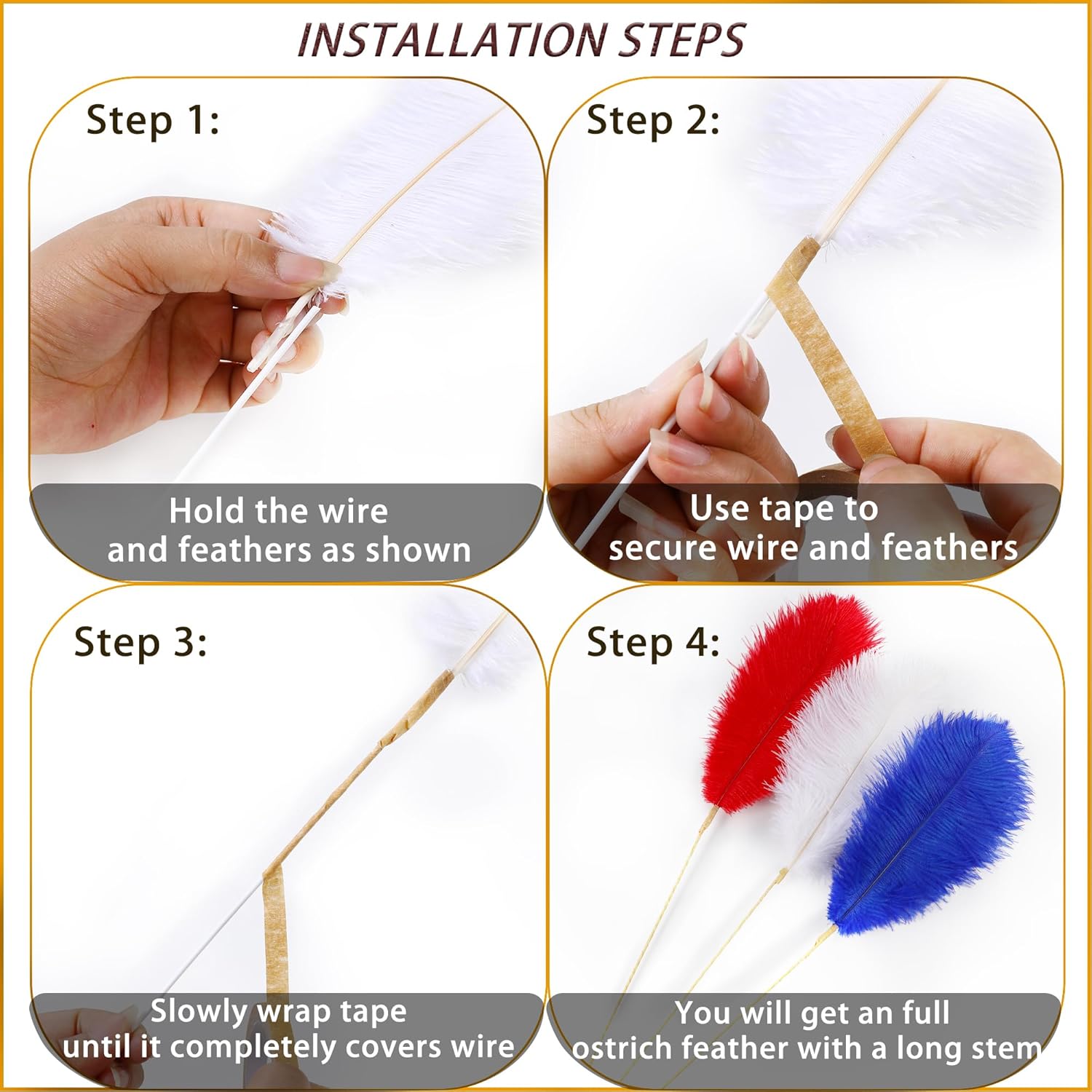 • 22inch Ostrich Feathrs Kit: 20pcs 10-12 inches Red, white, and blue mixed ostrich feathers, 20 pcs 10 inches long iron wire, and a roll of 15m light brown tape. Rich set content to meet your decoration and use needs