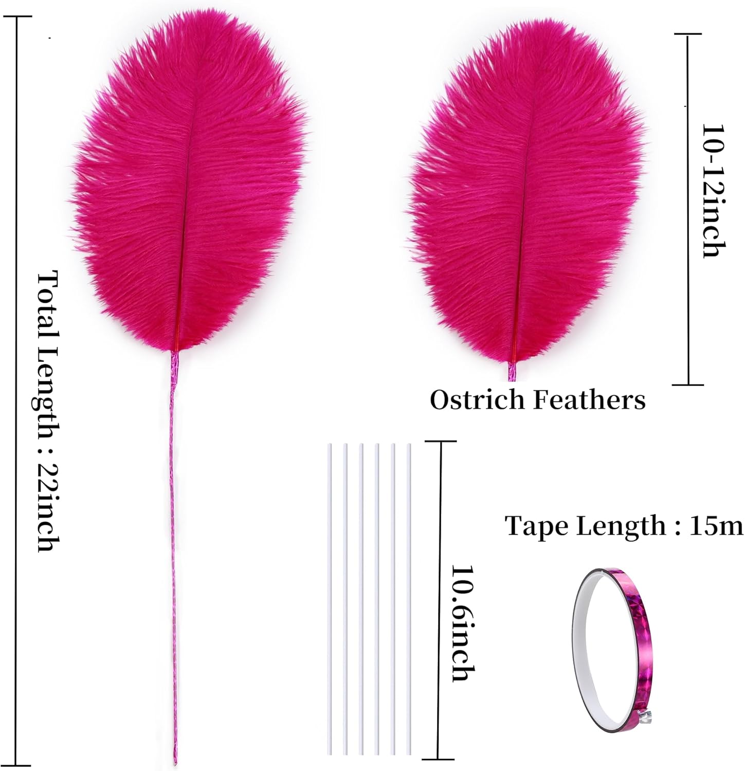 • 22inch Ostrich Feathrs Kit: 20pcs 10-12 inches hot pink ostrich feathers, 20 pcs 10 inches long iron wire, and a 15m tape in the same color with the feather. Rich set content to meet your decoration and use needs