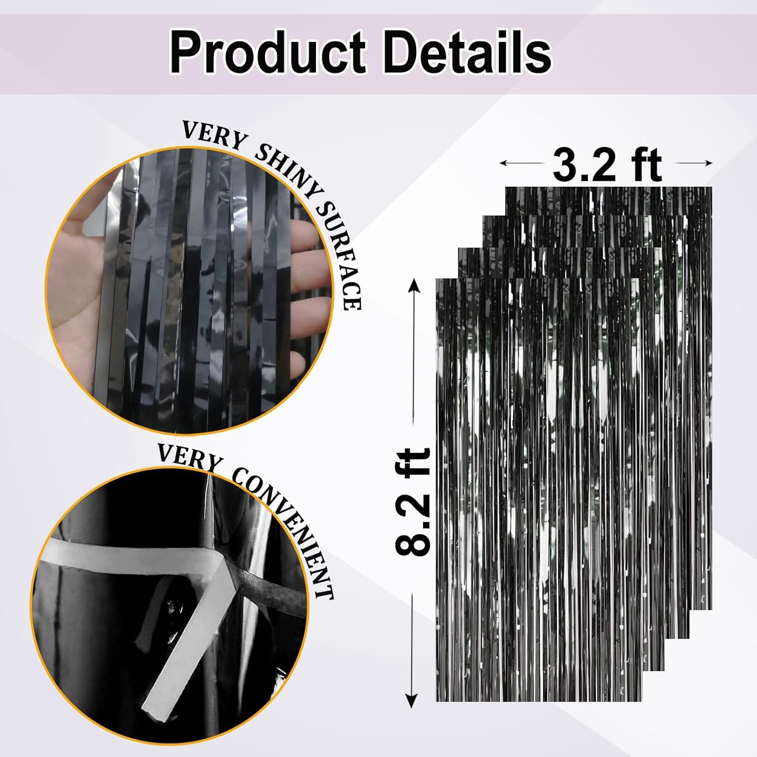 • 🖤【BLACK TINSEL BACKDROP】Value pack of 4, each measuring 3.2ft x 8.2ft (1m x 2.5m), Perfect Size for creating backdrops or photo booths.