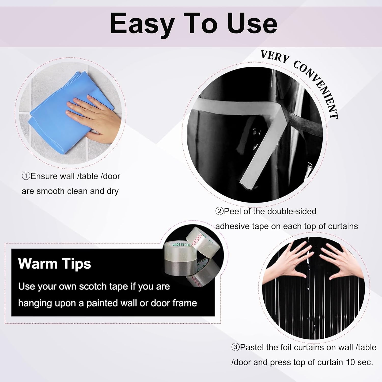 • 🖤【EASY TO USE】Let your home is no longer tedious,create warm atmosphere for your family. It only takes two steps--step1:Tear off the back of double-sided adhesive tape. step2: Paste the foil curtain on wall/door/table to decorate your party
