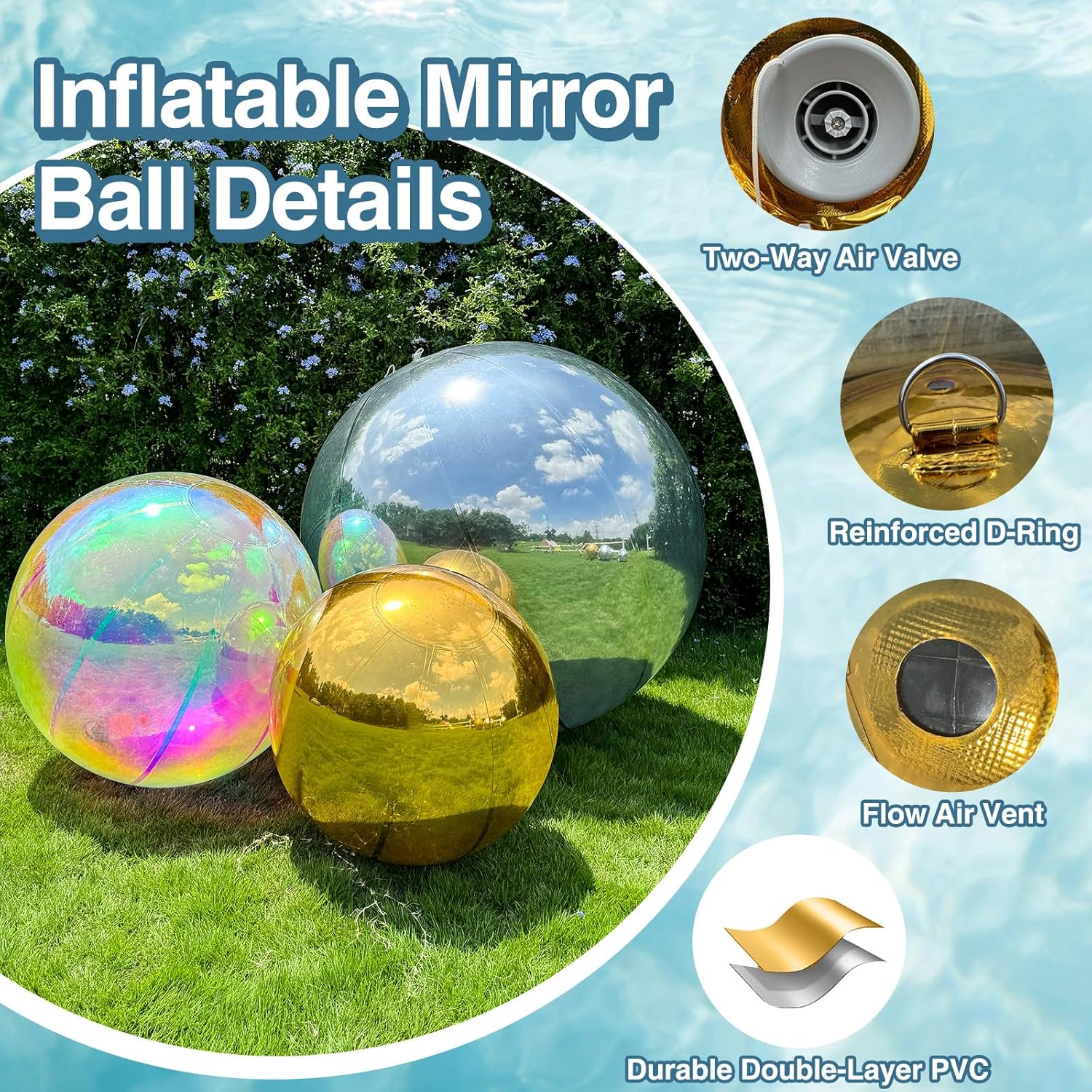 • Points to Note: To maintain airtight integrity, keep the inflatable mirror ball away from sharp objects during use. Inflatable pump not included. Please purchase separately and ensure the pump nozzle is compatible with this product.
