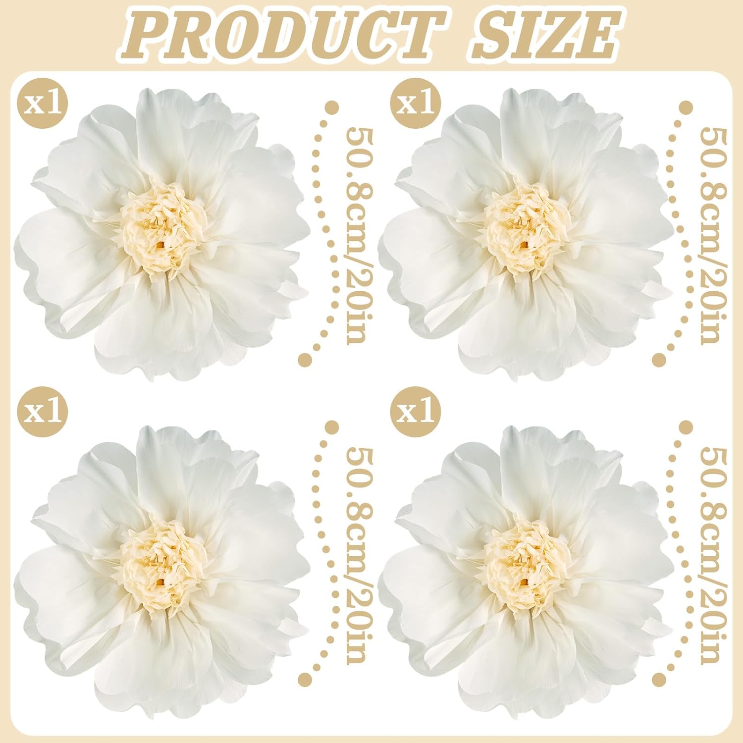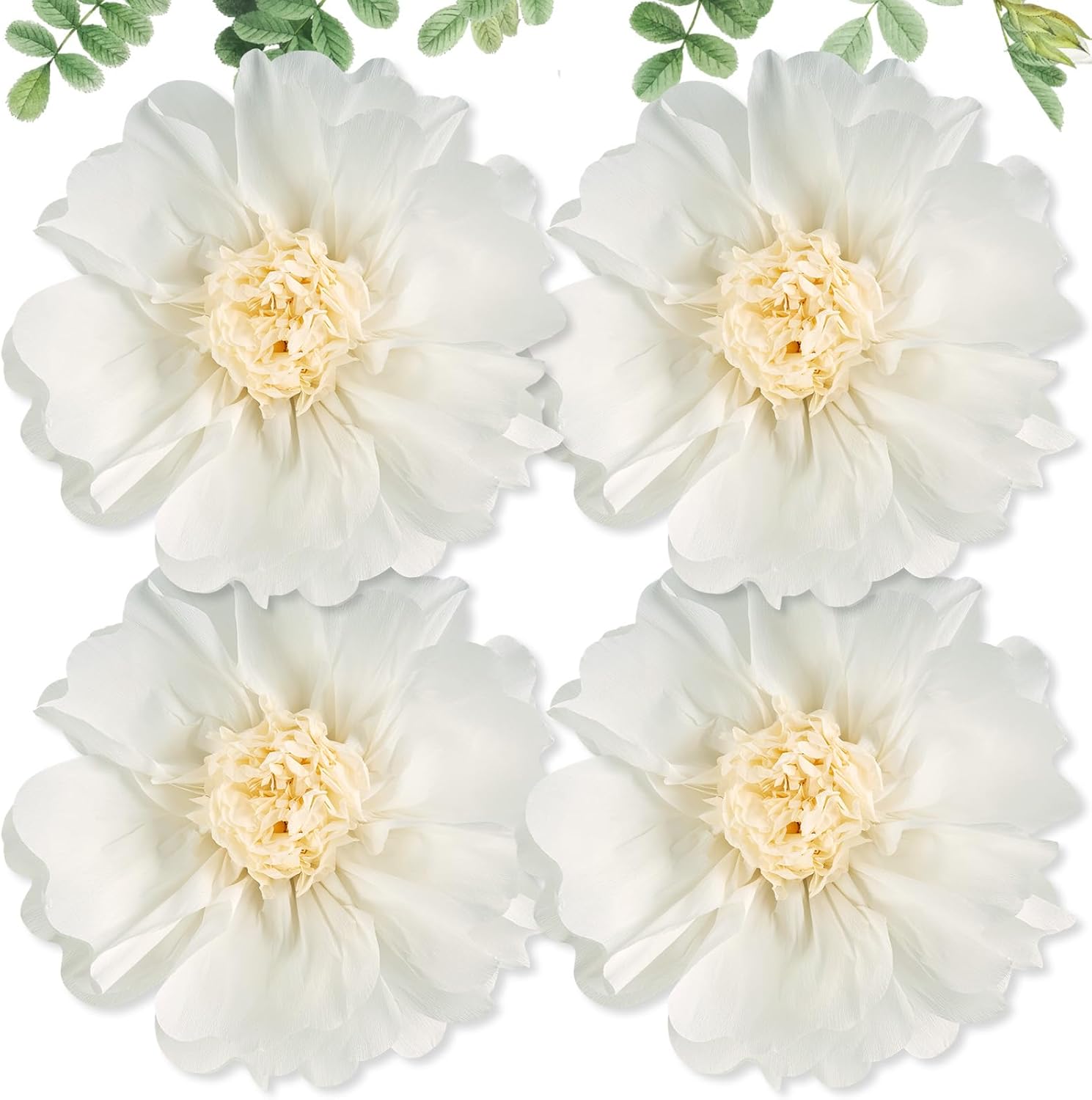• 💮【LARGE SIZE, QUALITY MATERIALS】: Measuring 20 inches in diameter, these giant paper flowers make a bold statement. Made with crepe paper petals which have flexibility and tear-resistance, and centers with an eye-catching design. Use the floral decorations for parties as eye-catching centerpiece table decorations, adding grandeur to any celebration. Perfect as flowers for backdrop decoration at your party. All four flowers are white.