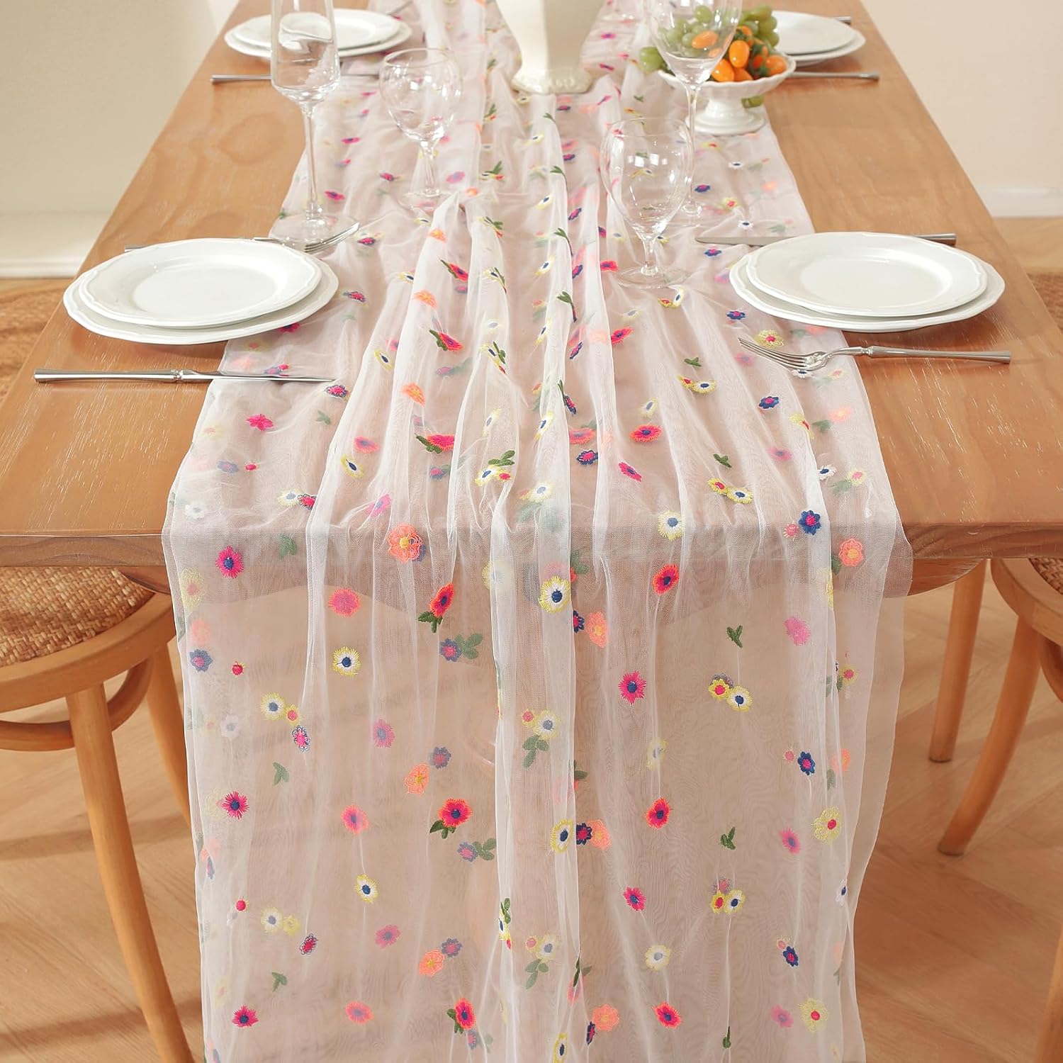 White Embroidery Daisy Fall Table Runner 120Inch 10FT Florals Soft Sheer Tulle Fabric Table Runner for Home Decor, Brithday, Wedding, Baby Shower ,Holiday ,Parties, DIY Craft,3PC