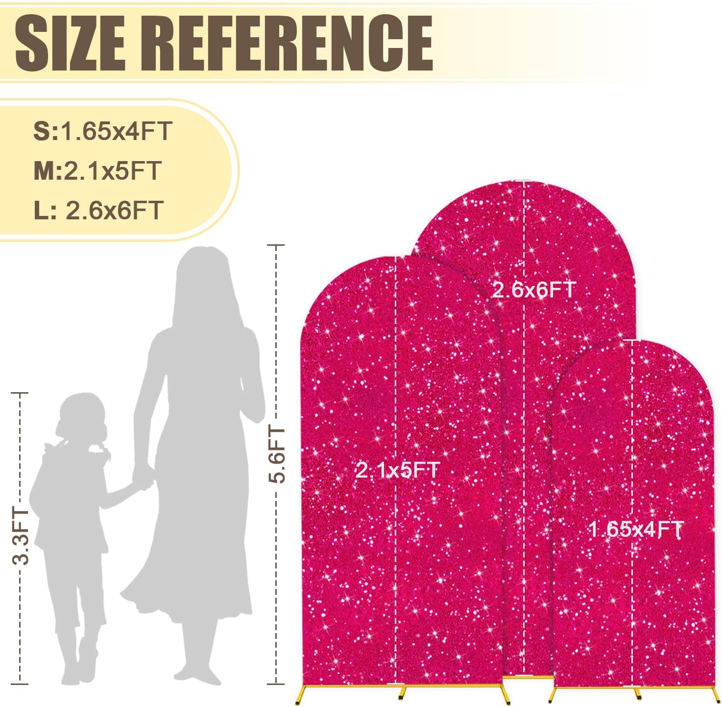 • ⭐Size Guide - Arch Backdrop Stand and Cover Set: The size of arch backdrop stand set about are 1.65FTx4FT(W x H), 2.1FTx5FT(W x H), 2.6FTx6FT(W x H) with hot pink arch cover set. Metal arch backdrop stand set add a graceful and striking look for your party or event.