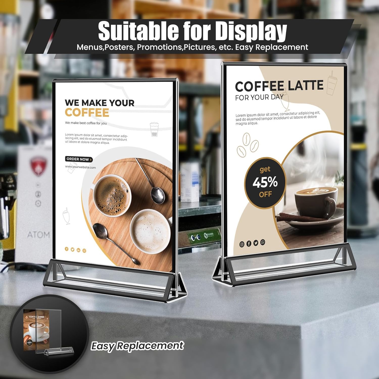 • 【Easy to Assemble】Only 3 steps to get the acrylic stand ready for use, firstly tear off the protective film on the acrylic blackblack frame, adopt the triangular groove base for better inserting the table sign or anything you want to display. At last, push the frame into the base. And if you want to store them, you can just separate the frame and base and put them into a box without any hassle.