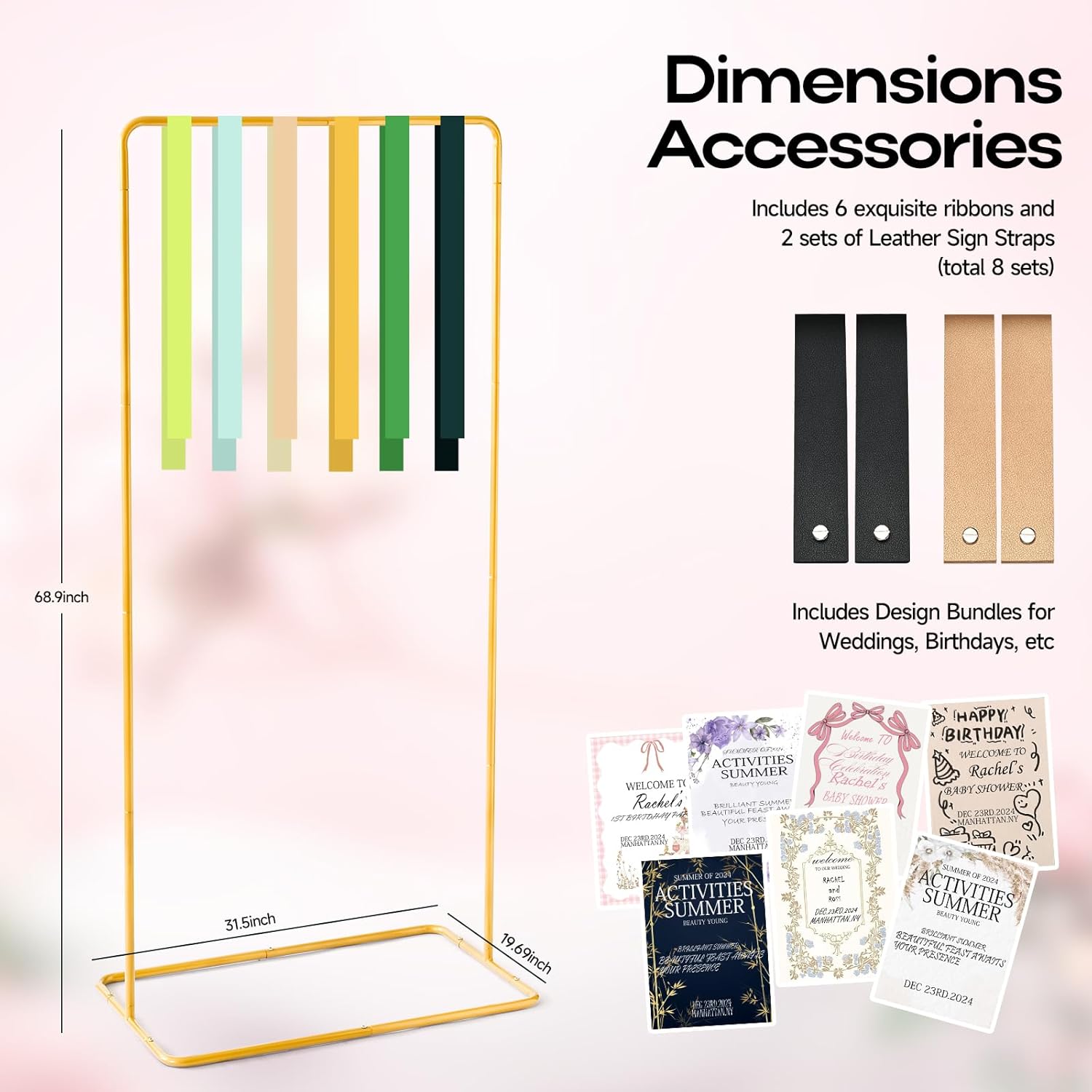 Wedding Sign Stand - Adjustable Wedding Sign W/Design Bundle & Leather Sign Hanging Straps, Durable Metal Easel Stand for Wedding Welcome Signs, Seating Charts, Ceremony & Reception Decor (Gold)