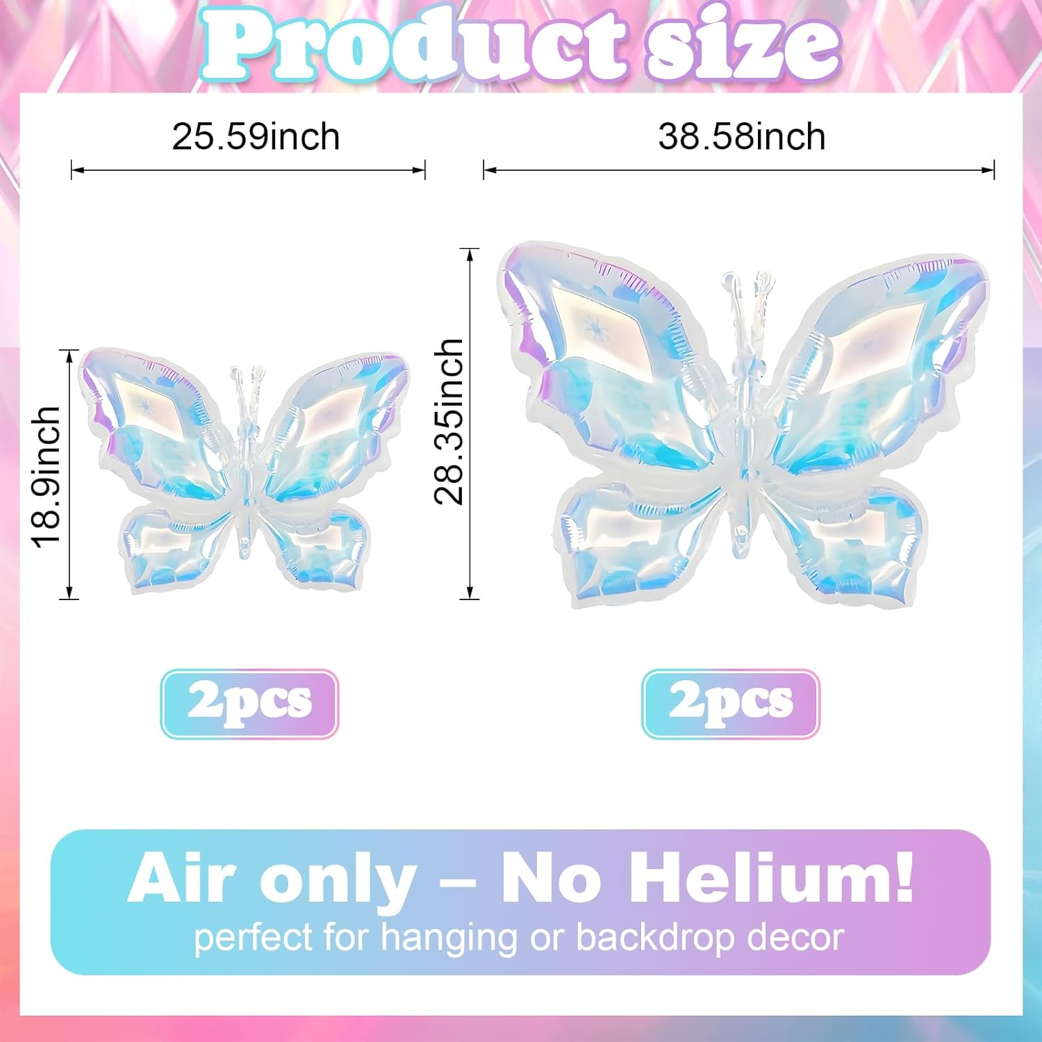 4Pcs Iridescent Foil Balloons, Iridescent Butterfly Foil Balloons, Rainbow Butterfly Holographic Clear Foil Balloon for Birthday Baby Shower Mermaid Rainbow Wedding Party Decorations