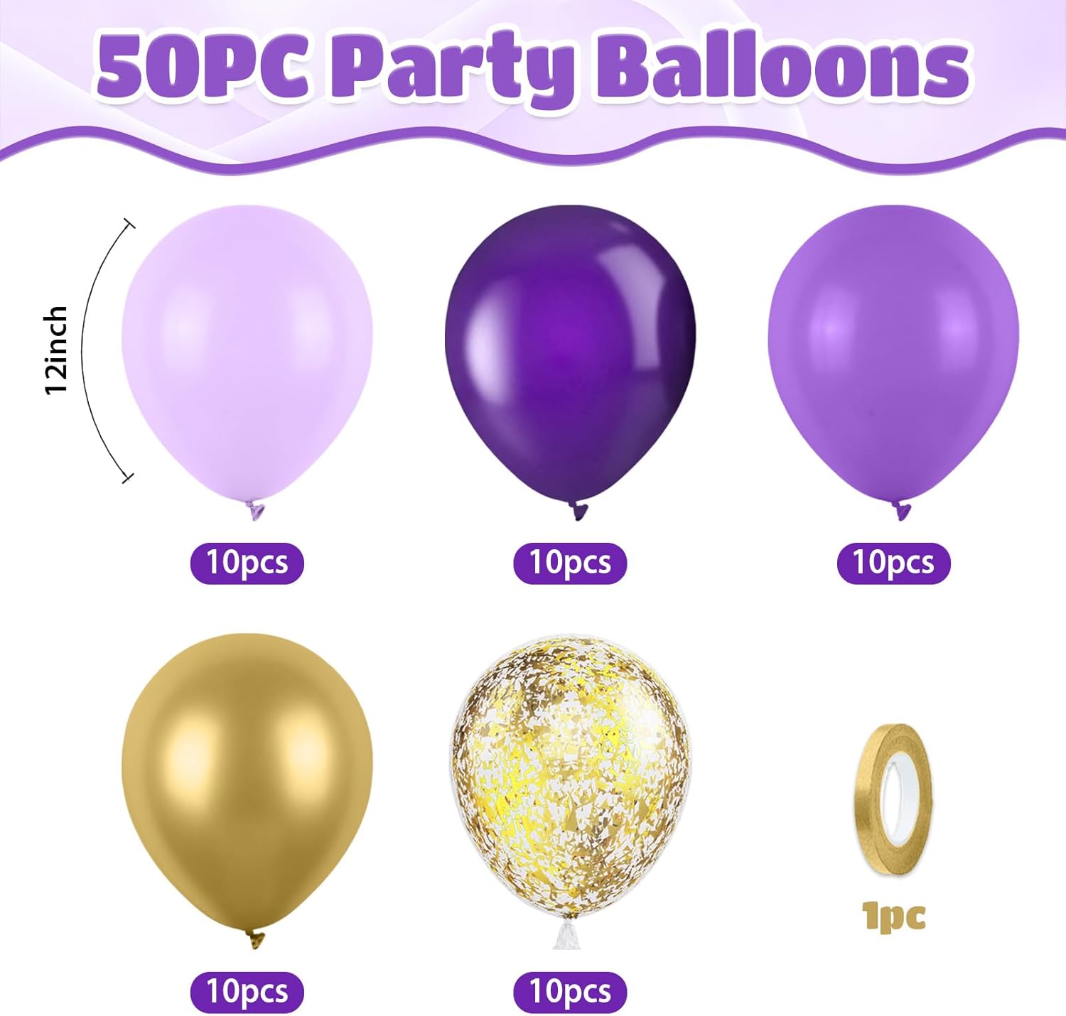 • Purple and Gold Balloons Set: 10pcs macaron purple balloons, 10pcs black purple balloons, 10 matte purple balloons, 10pcs metallic gold balloons, 10pcs gold confetti balloons, 1pc gold ribbon in our party balloons set. These decorations effortlessly elevate any event—no need to overthink your party setup. It’s all about creating a playful and elegant vibe.
